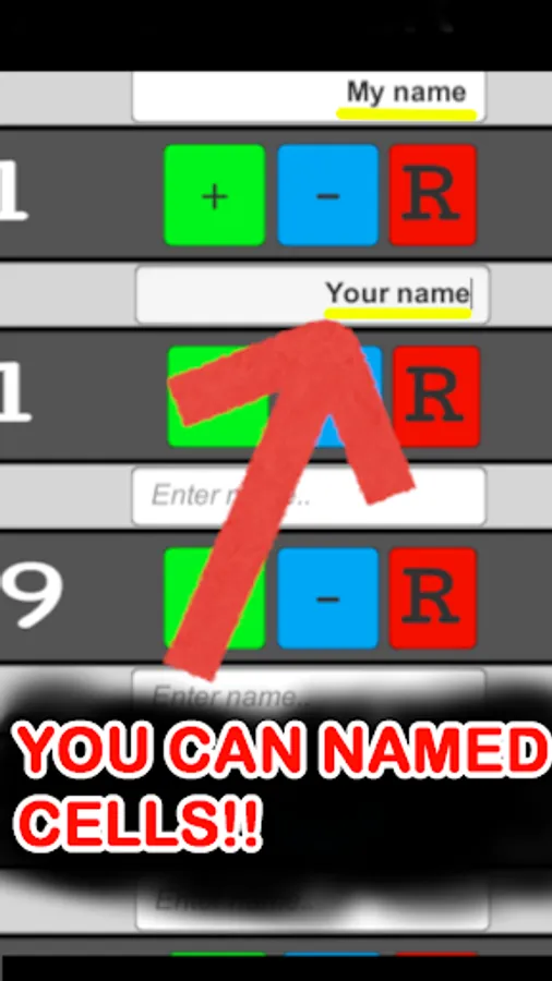 You can also add a name at all cells(tap in the box and add a name). To point up touch +, down -, reset R. You can do the same thing with the button below for all cells.