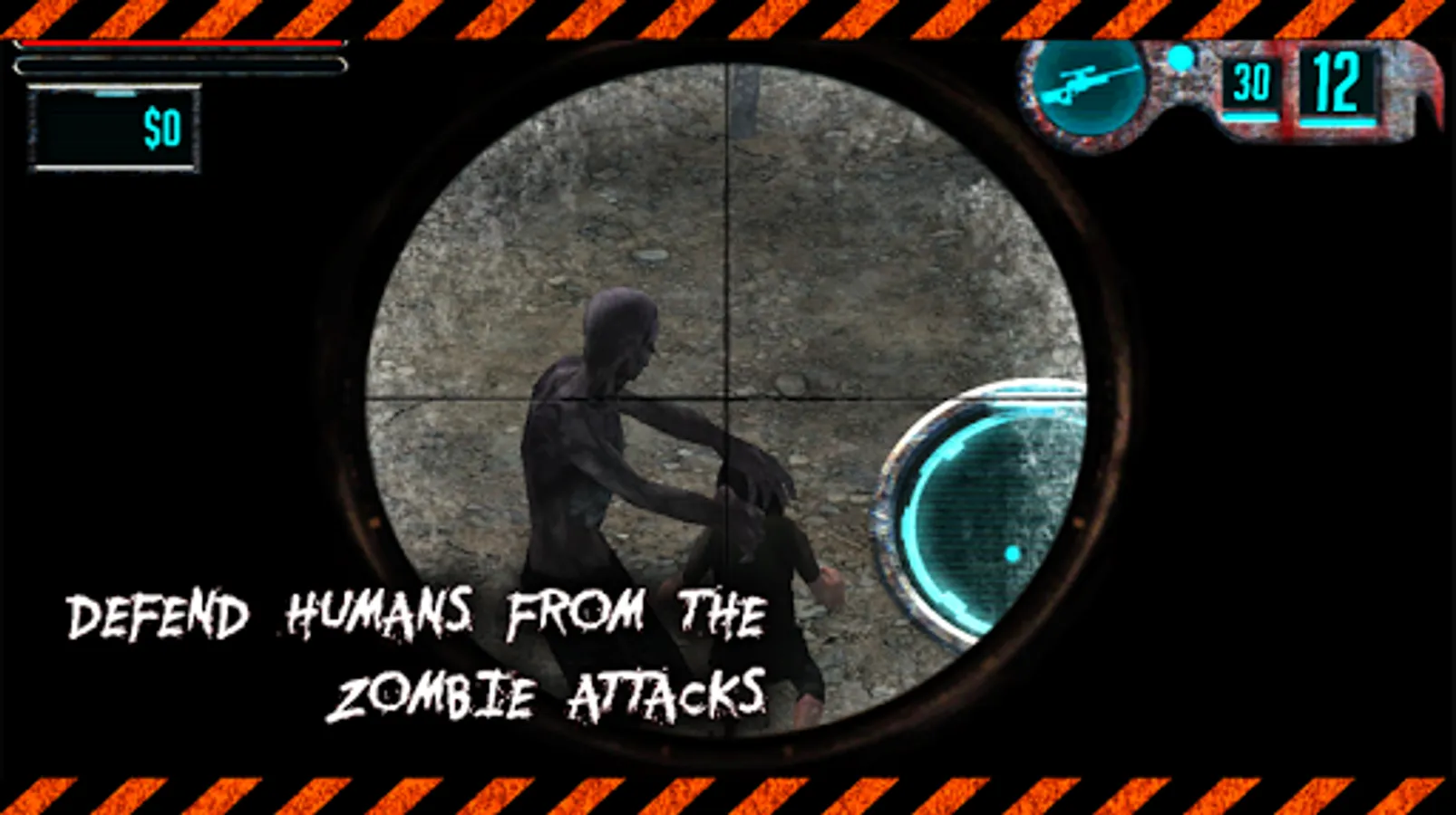 You are a sniper on a roof and must protect civilians that there are in the street. Waves of zombies will come to attack them and you must kill the zombies with the sniper rifle before being hurt.