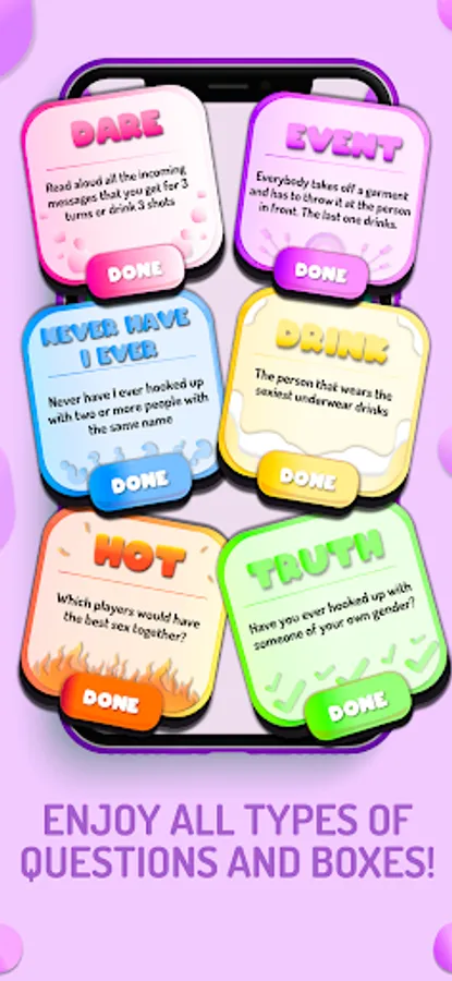 📚 Great variety of questions of each type elaborated with many years of experience in the field. From party animals for party animals. Delight your eyes while playing drunk games. With the beautiful design of this house party trivia app you do something good for your eyes! Be ready for the most naughty party truth or dare.