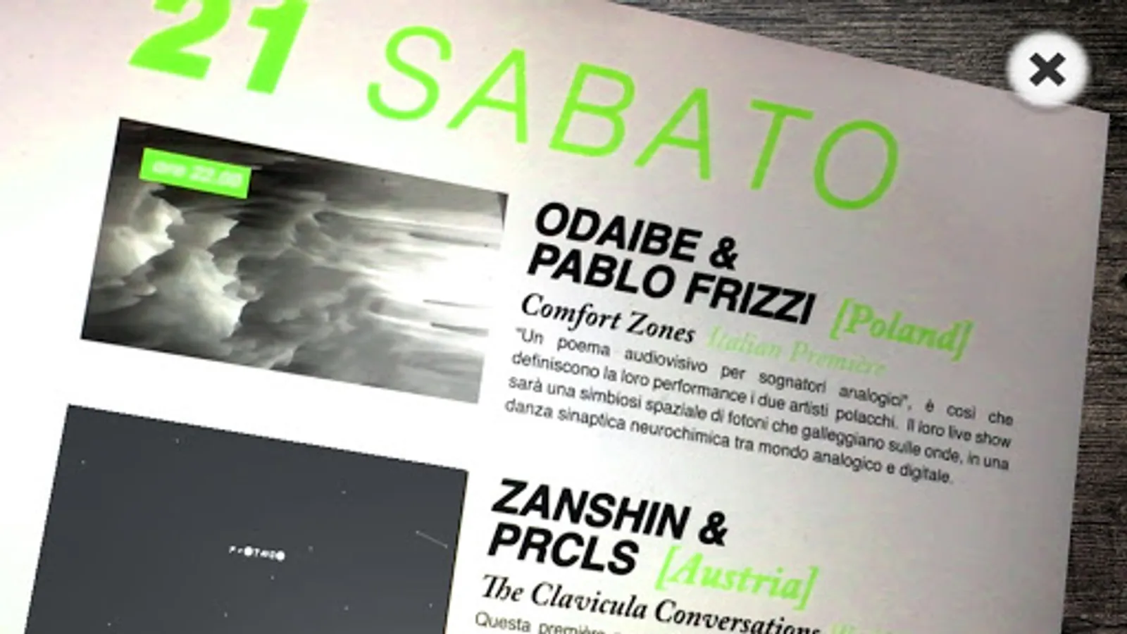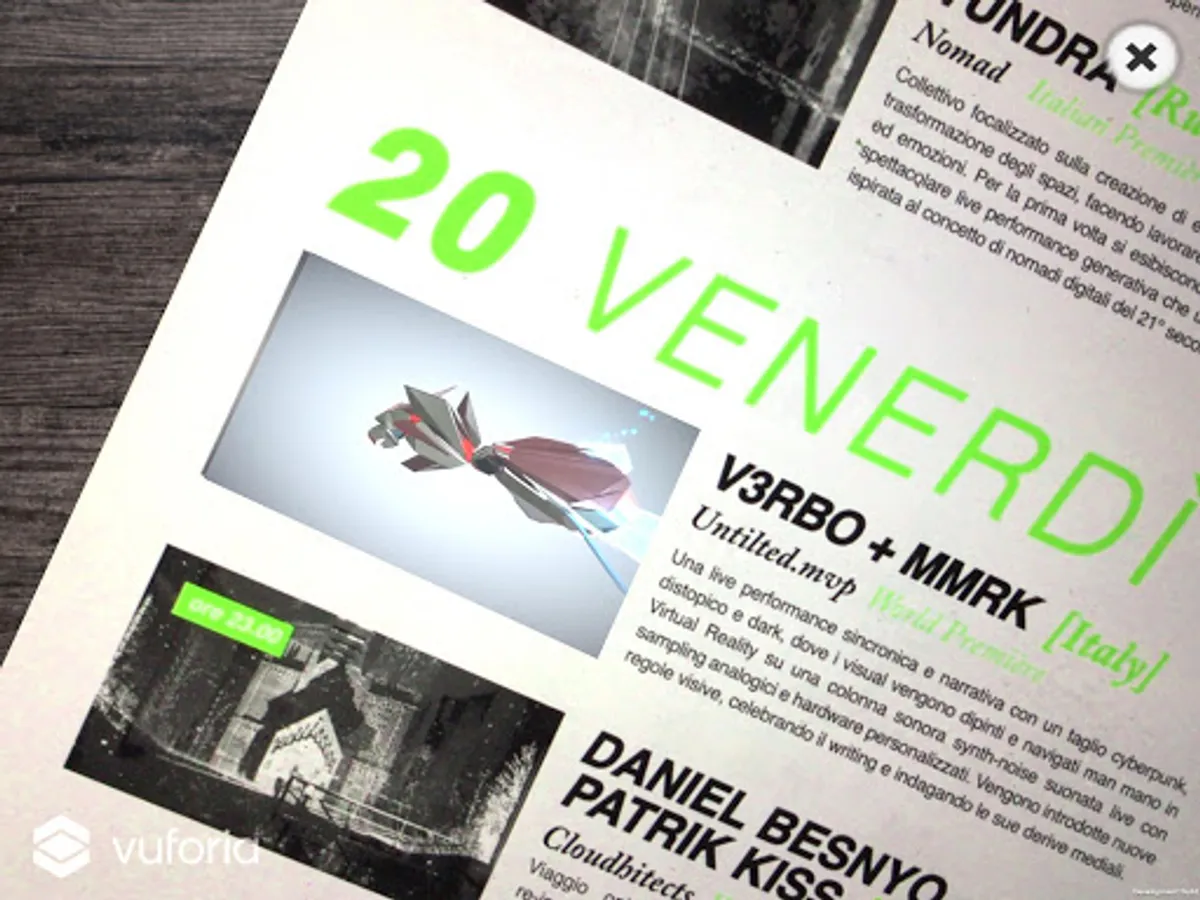 LCF app lets you explore the official Live Cinema Festival performance showreel from every artist plus the incredible artwork of Verbo. To be able to explore this extra content you have to find the leaflet of the festival and enjoy the AR (Augmented Reality) build on it.