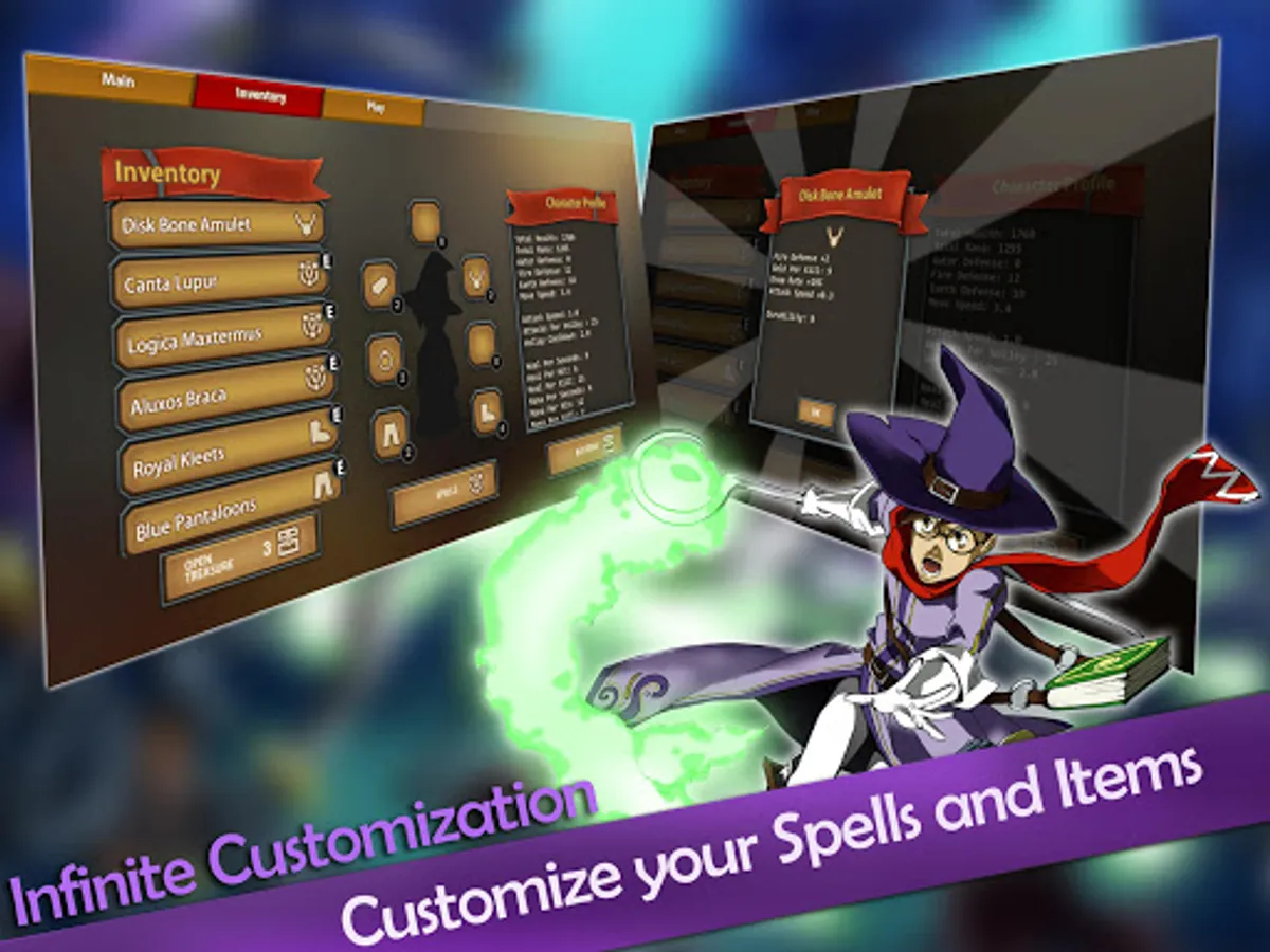Wide variety of spells with various strength and effects. Battle using different elements and inflict different status to your enemies. Set your enemies on fire, stun them, slow down movement, and more!