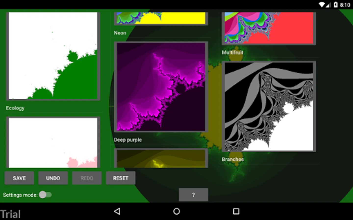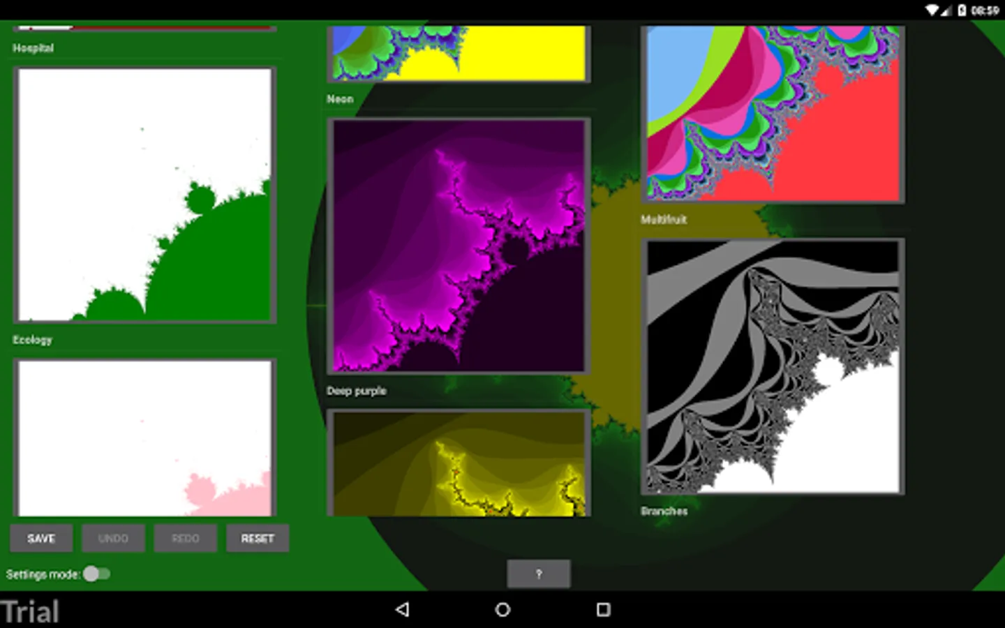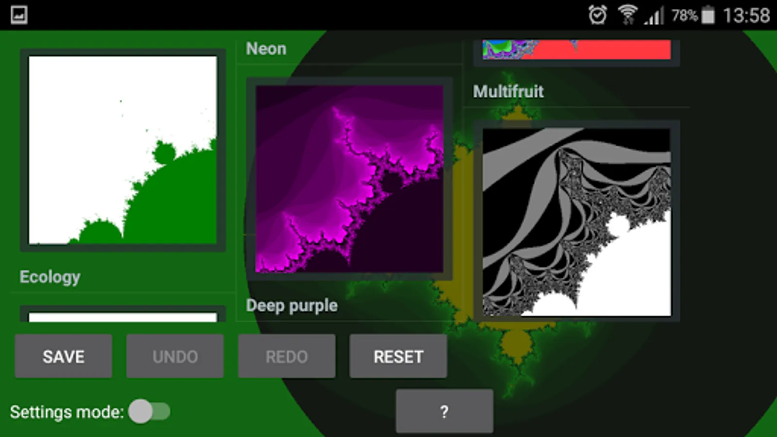 Explore the fractal "Mandelbrot Set", colour it, create your own colour themes and get fantastic surrealistic pictures! There are also advanced fractal managment issues.