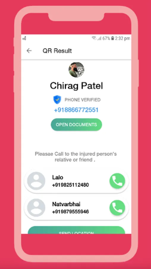 - Any one can select two reference form mobile contact and generate Vehicle QR and stick to your vehicle , If incase the application user get an accident any other user around can scan the QR and he will get to see reference number he can contact them to reach at place .