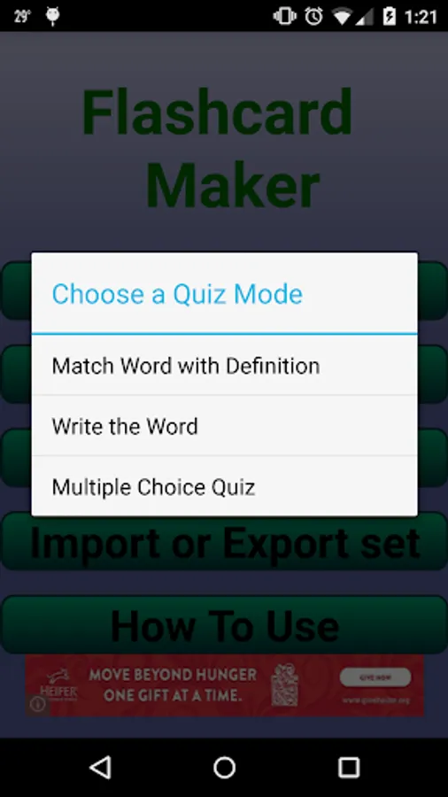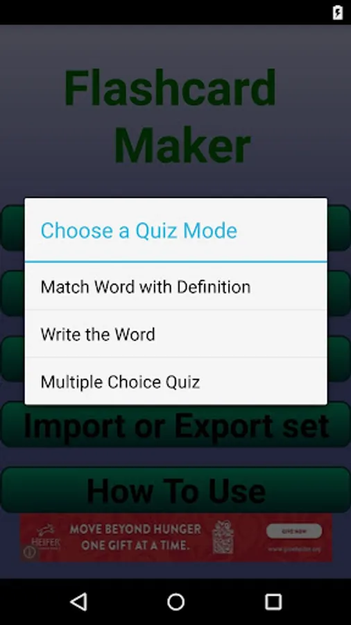 Flashcard Maker is a simple and easy-to-use application that assists studying and memorization of terms. This application allows for the manual creation of unlimited sets of flashcards within your device AND importation of existing flashcard sets from Quizlet! Have any doubts about how well you've mastered a deck? Try one of the three excellent quiz modes! Stronger preparation for courses is guaranteed with this application. The application's features allow for maximum studying efficiency with minimal time investment. Application features include: