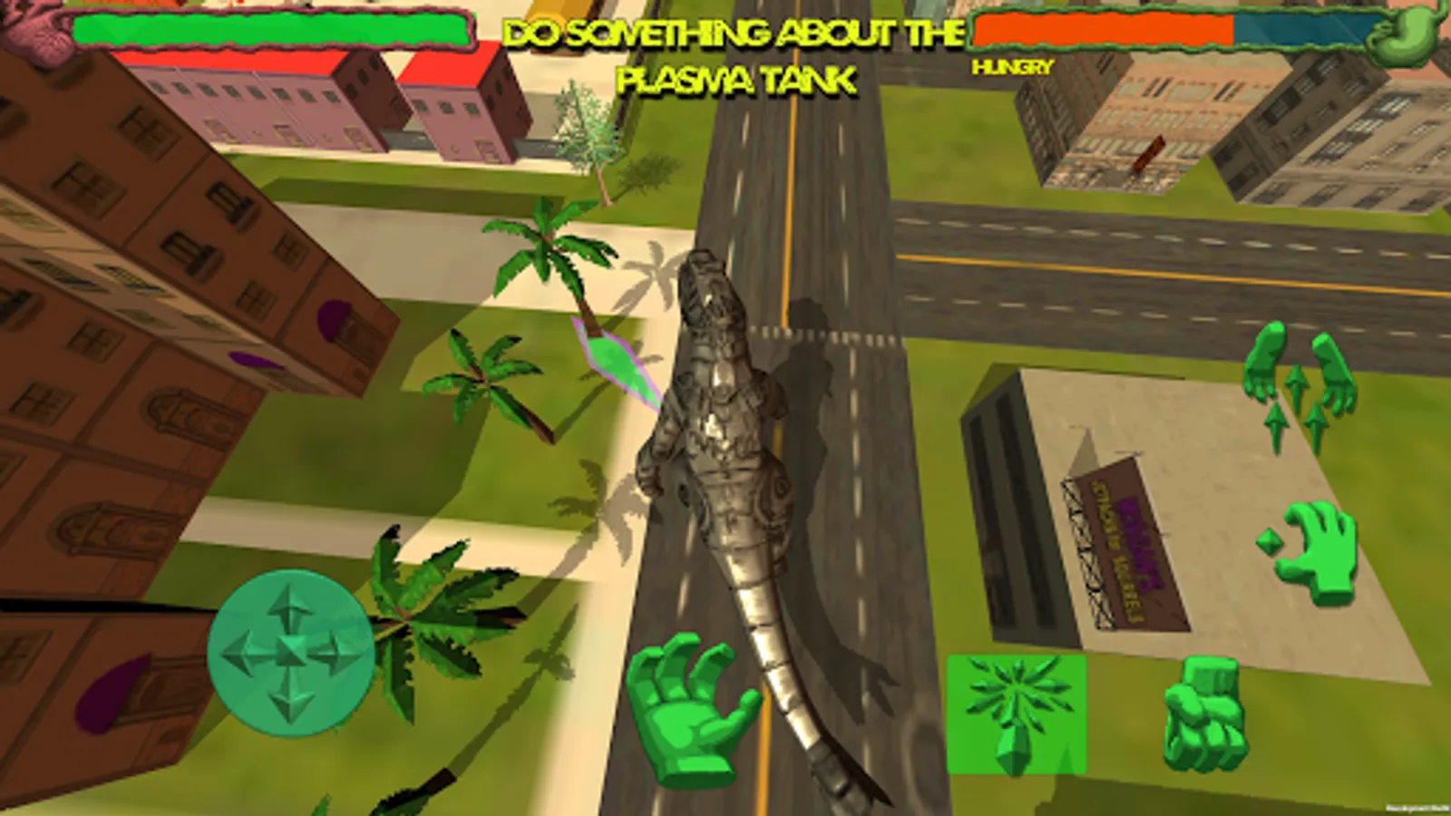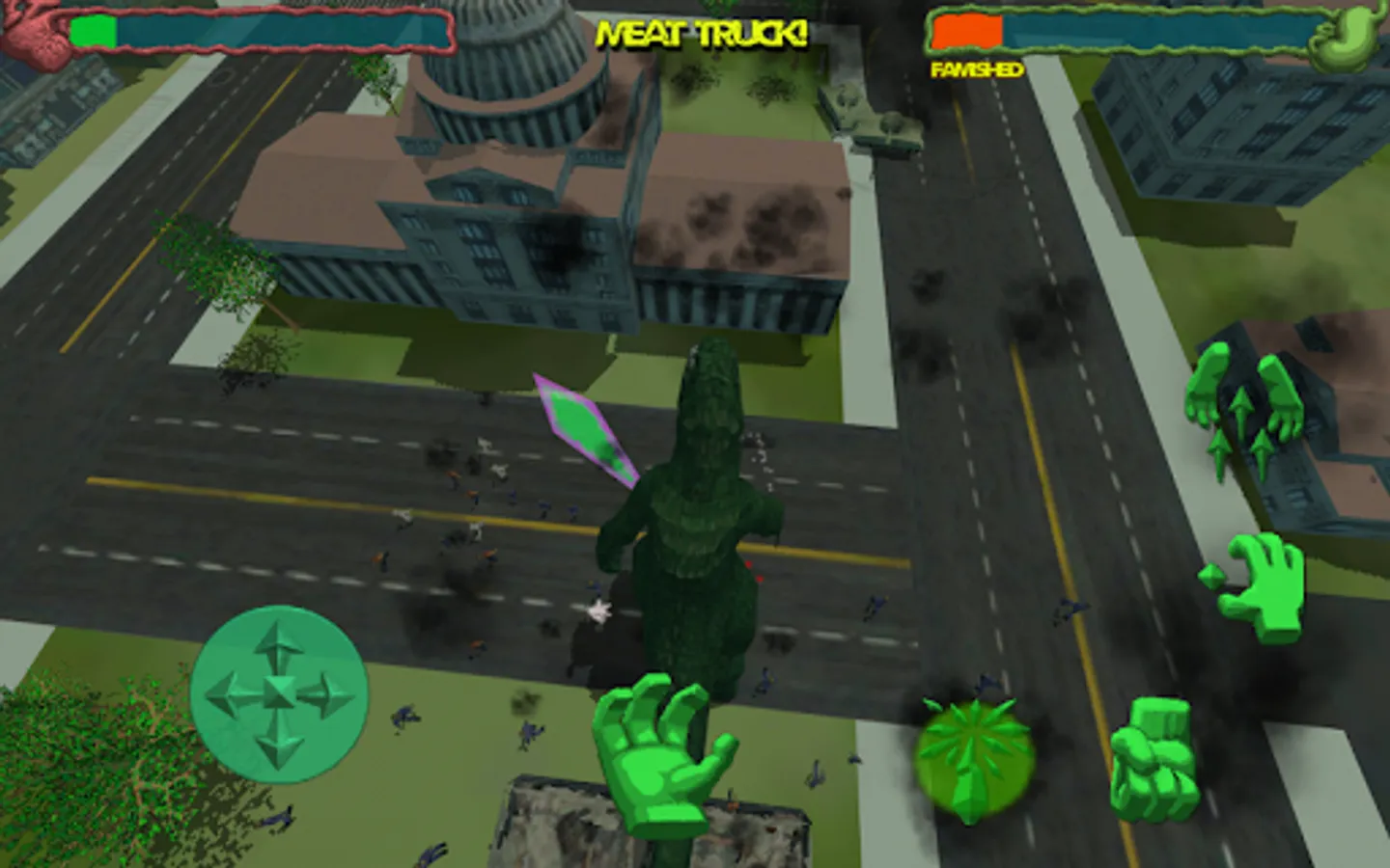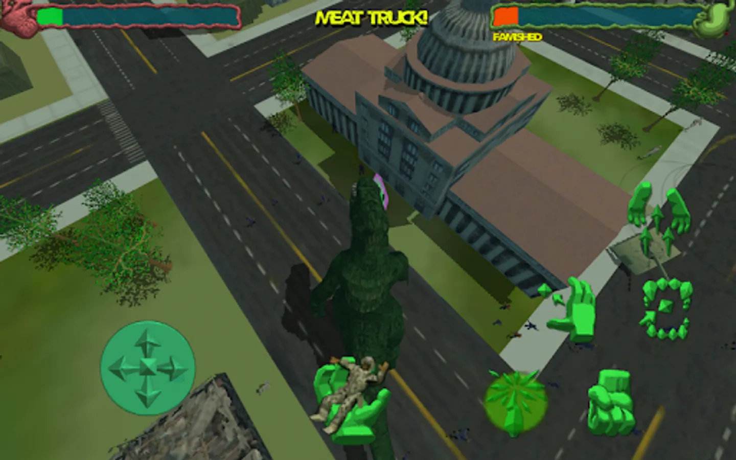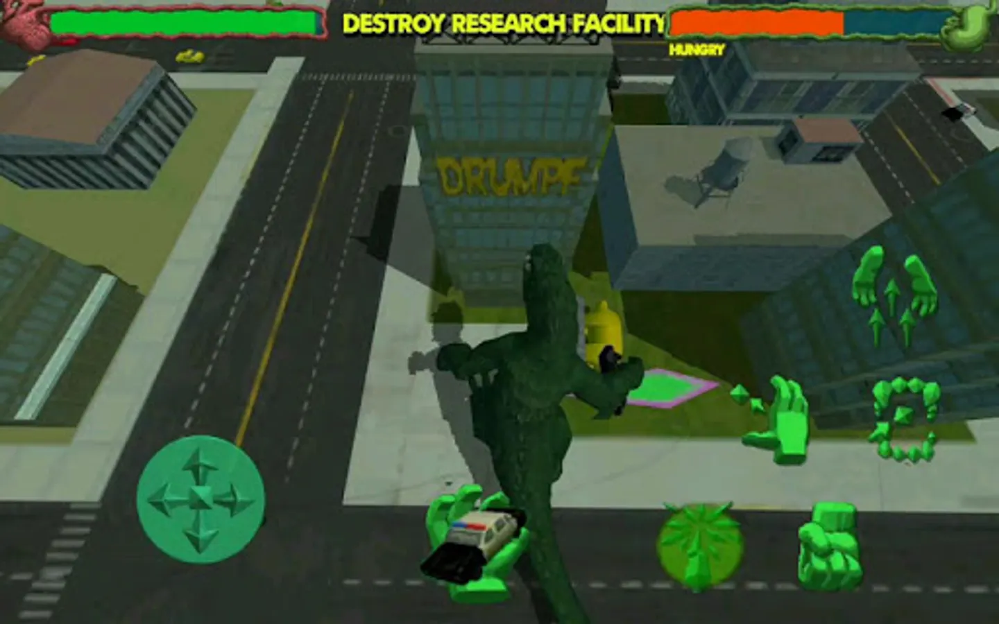 Grab and smash, throw, eat, or avoid the hostile city defenders.