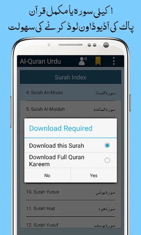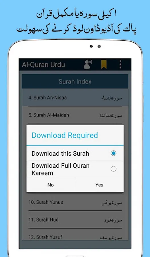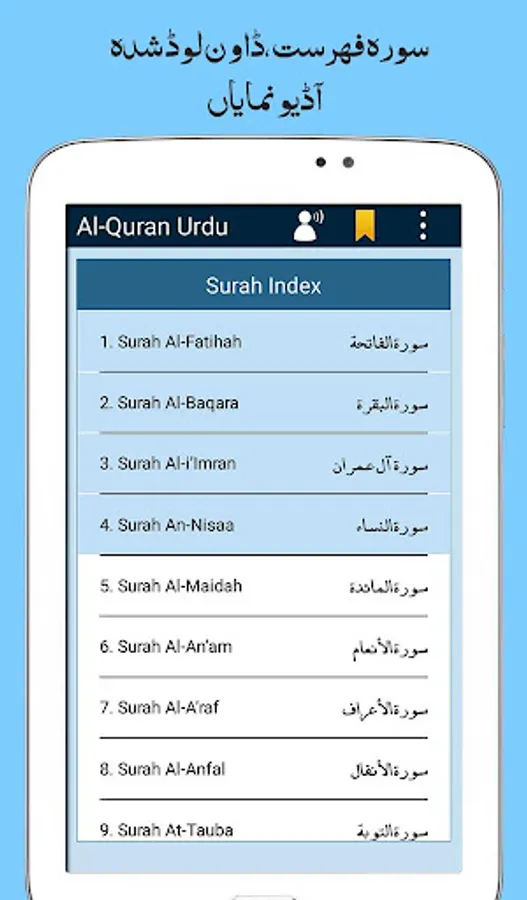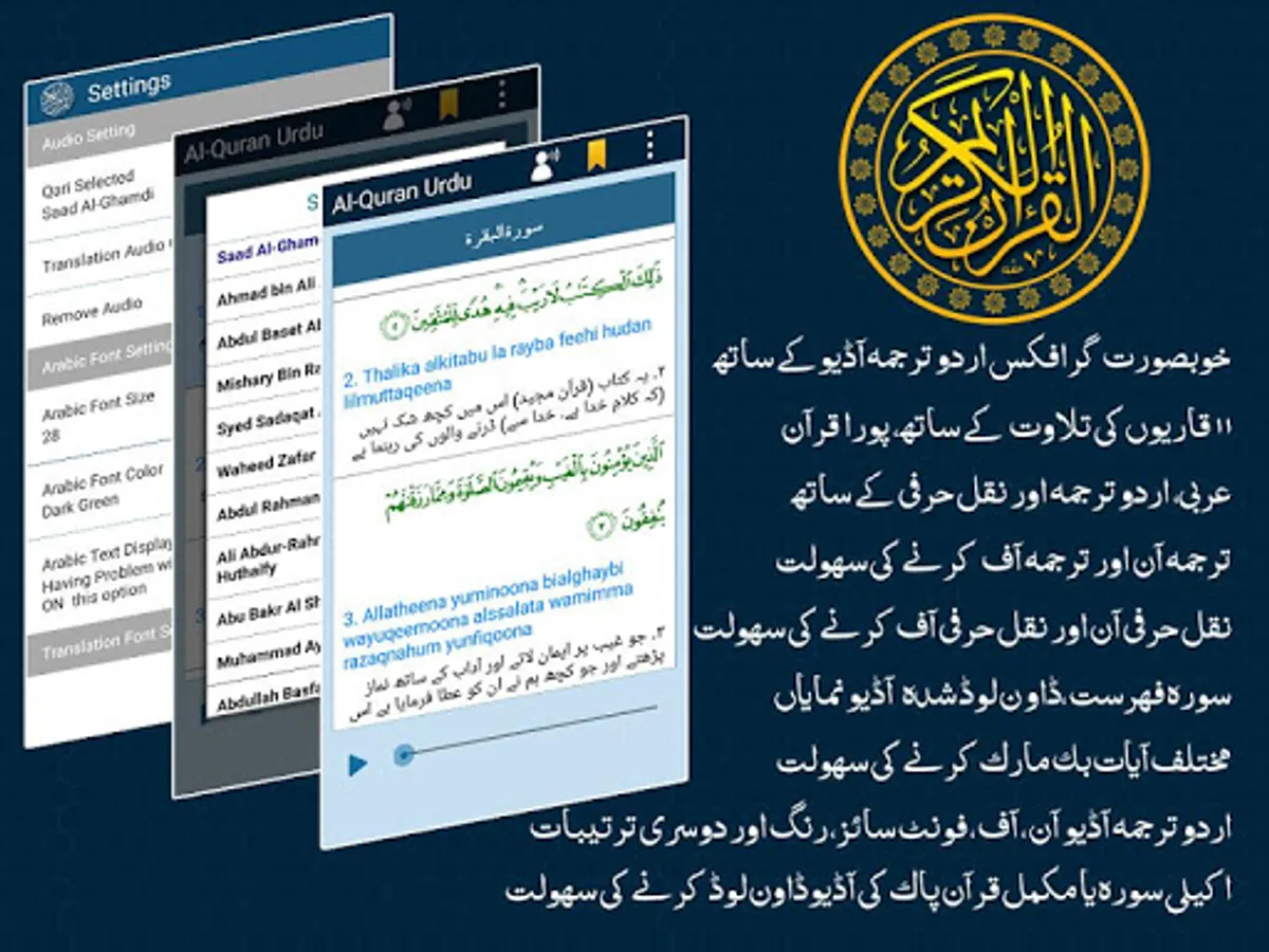 Quran Pak Urdu Tarjama: (القرآن الكريم) First Ever Al Quran App on market which allow you to Select any Qari from 17 Famous Qurra list and listen Audio translation along with Tilawat to better understand our Holy Book Quran. This Quran Majeed app allows users to download Single Surah or Complete Quran Audio of any Specific Qari with Single Touch.