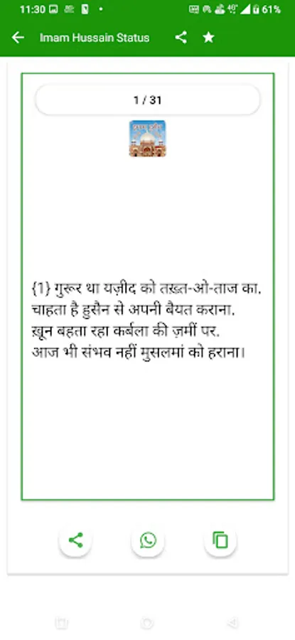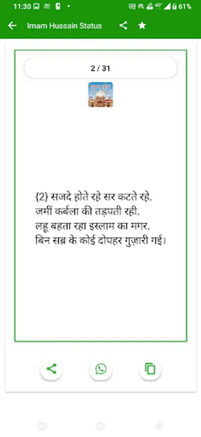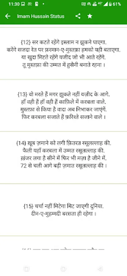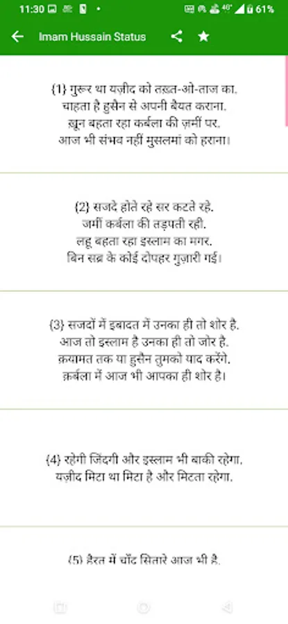 so guys hamne is app Imam Hussain Status Hindi me bahut sare status ko shaamil kiya hai hindi me aap is app ko download karke asani se use kar sakte ho, Imam Hussain Status Hindi app apke liye bahut helpfull hone wali hai is app ko hamne poora hindi me banaya hai aap hindi me is app ko asani se pad sakte ho, Imam Hussain Status app best app hone wali hai, guys agr aapko is app ko use karne me koi problem dekhne ko mile to aap hamse problem share kar sakte ho.