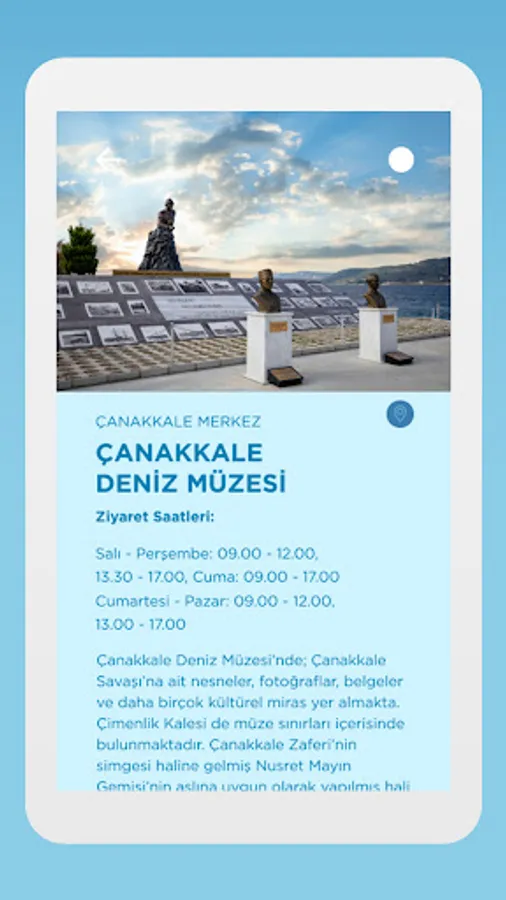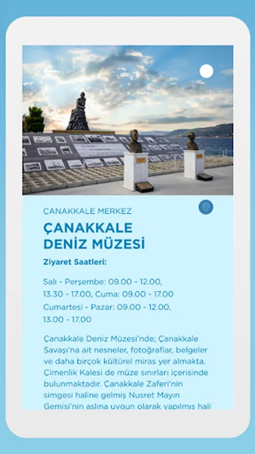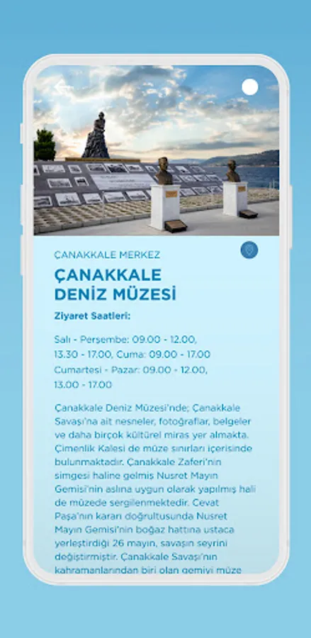 You can easily find touristic points such as historical artifacts, ancient cities, museums, hiking trails, beaches, islands, plateaus and camping areas in the Bir Nefes Çanakkale application.