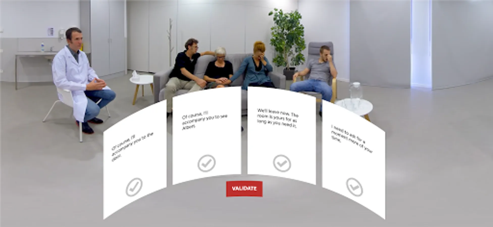 Using VR cardboard glasses, students will find themselves in front of the patient’s family, they will make decisions that will affect the course of the experience, they will get personalized feedback on their decisions and they will be provided with a final debriefing.