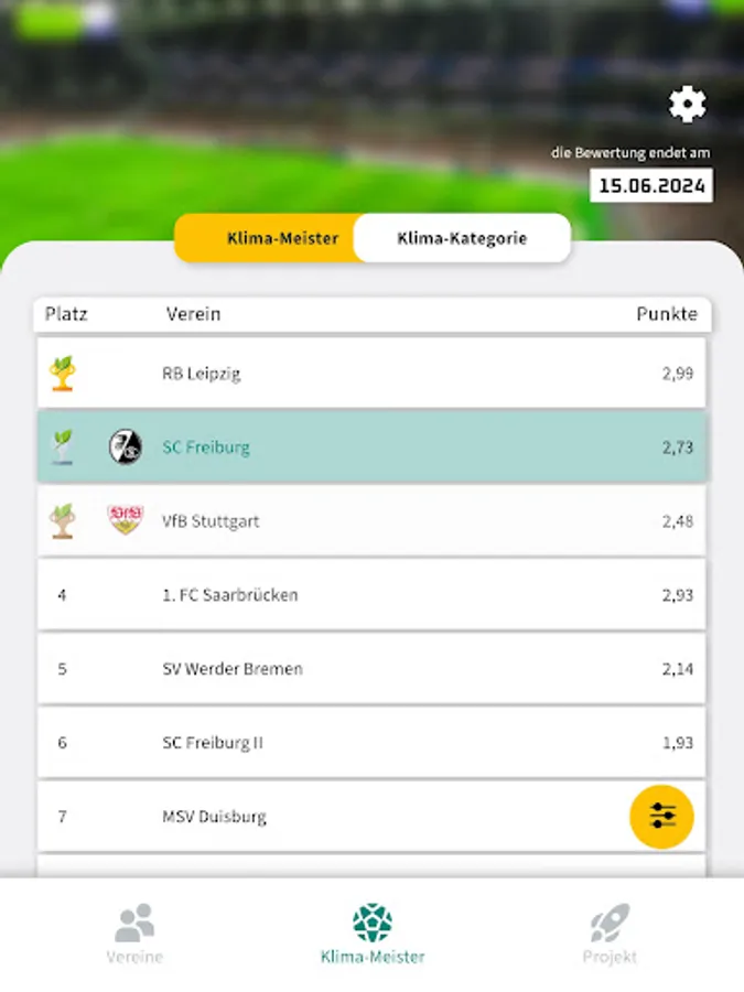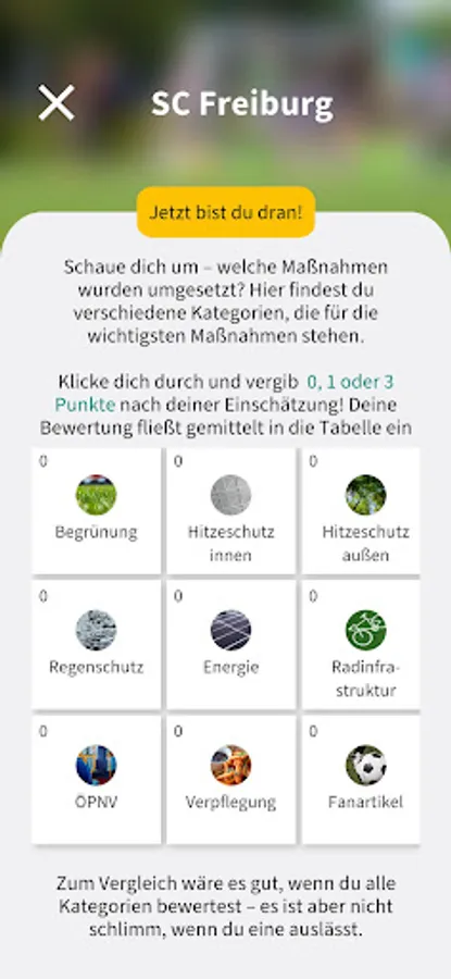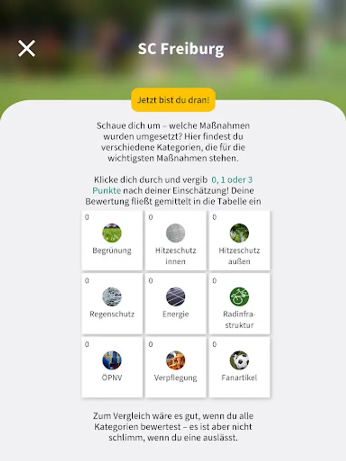 The core of the “Kick-off for the Climate” project funded by the BMUV is our Climate Master app. You can use it to evaluate the football location for its climate suitability the next time you visit the stadium. You award points for various criteria, from bicycle stands to heat protection measures, and help to set up the climate master table. Who will be climate champion at the end of the season? Figure it out!