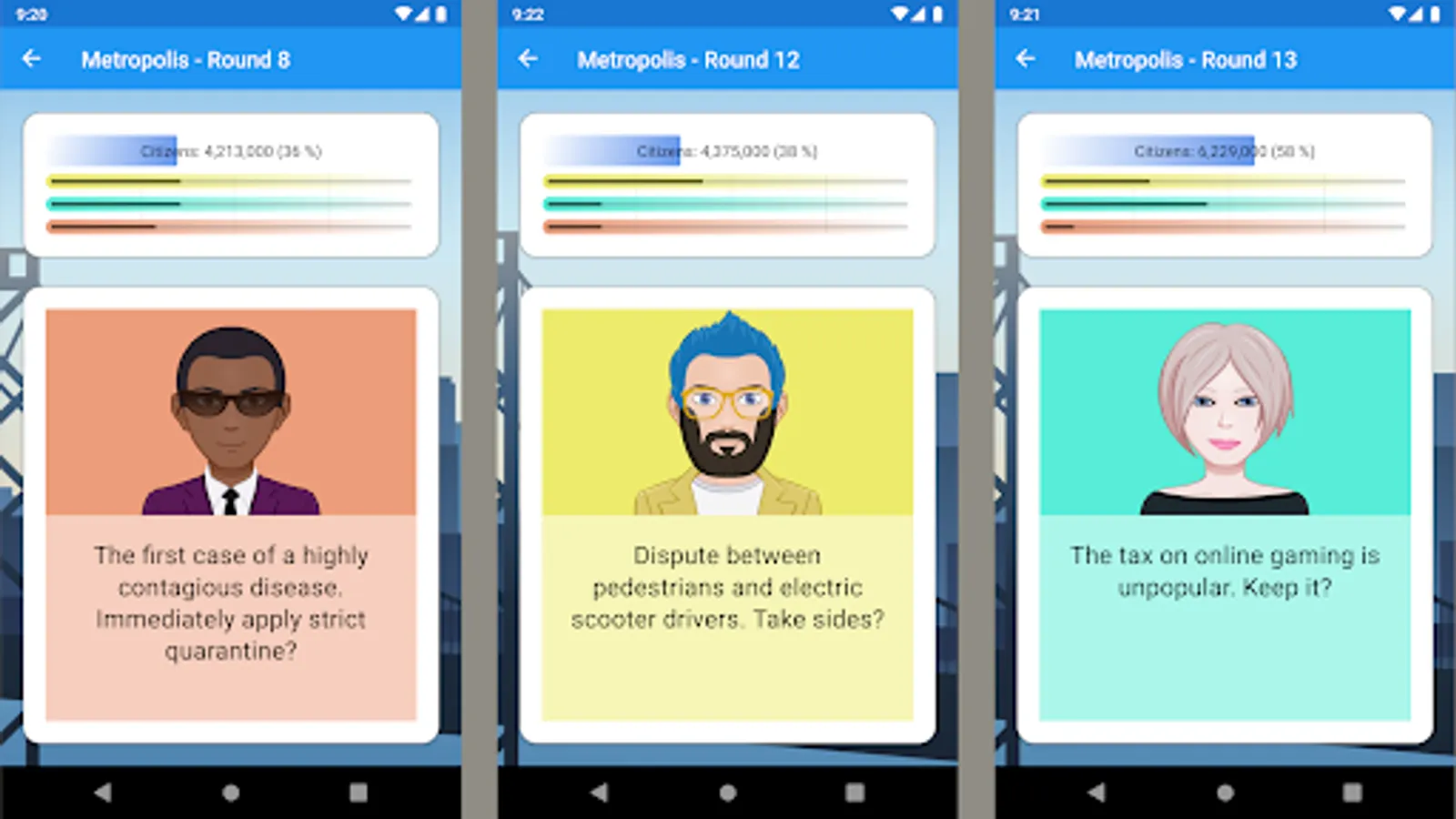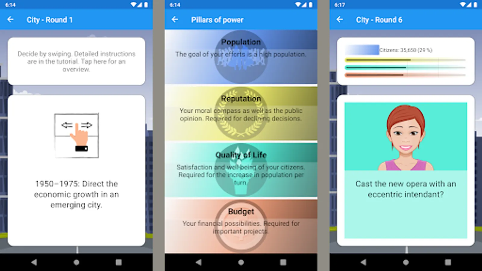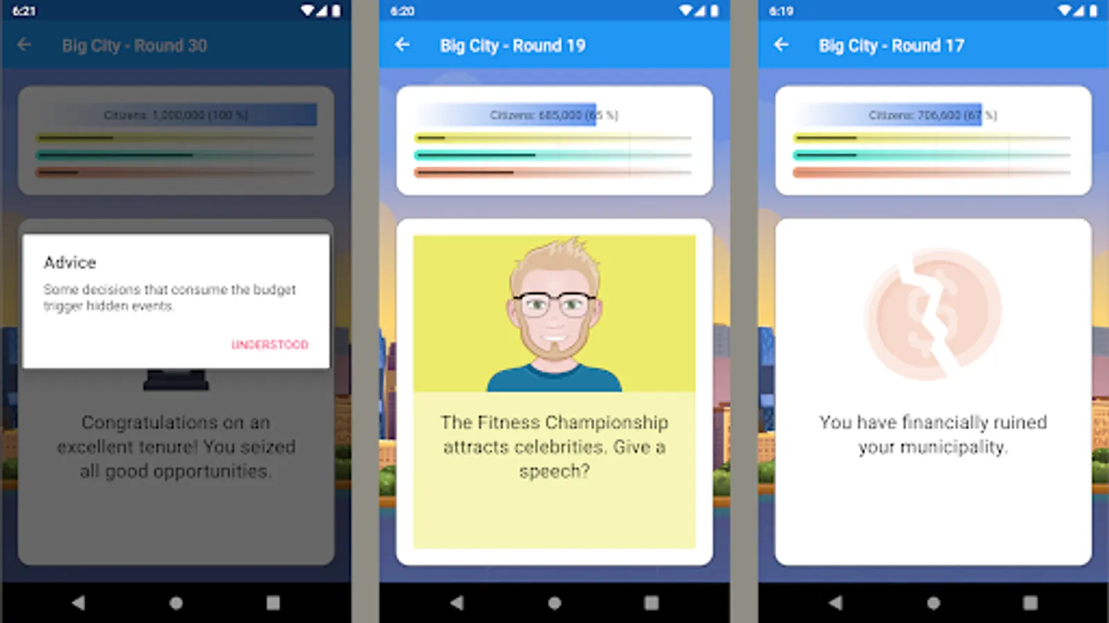 The long-term effects of your decisions are determined for each event. The more appropriately you react to different events, the more often you will be successful as mayor.
