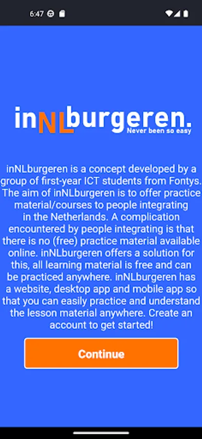 inNLburgeren is a concept developed by a group of first-year ICT students from Fontys. The aim of inNLburgeren is to offer practice material/courses to people integrating in the Netherlands. A complication encountered by people integrating is that there is no (free) practice material available online. inNLburgeren offers a solution for this, all learning material is free and can be practiced anywhere. inNLburgeren has a website, desktop app and mobile app so that you can easily practice and understand the lesson material anywhere. Create an account and get access to the practice assignments and your own learning process.
