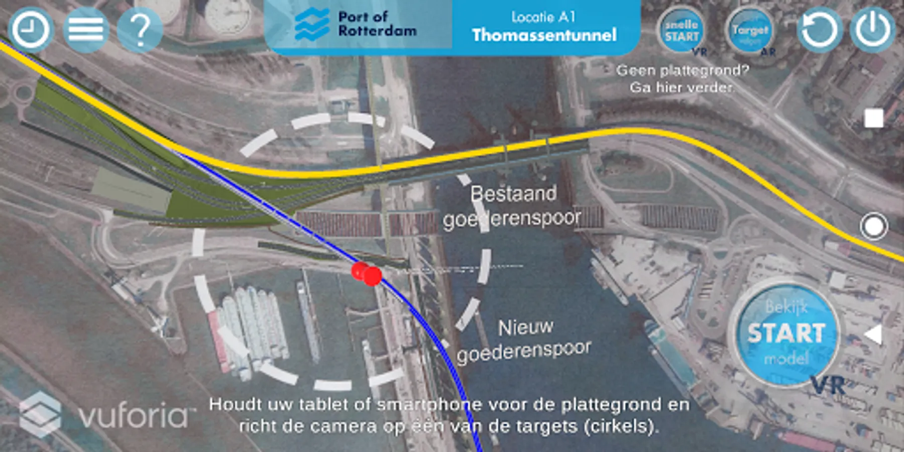 Point the camera of the smartphone or tablet at one of the markers and you will immediately zoom in on that location. The new situation is projected on the aerial photo through Augmented Reality. View the order when which part will be built. Follow the current route for freight transport by rail and discover what it will be like.