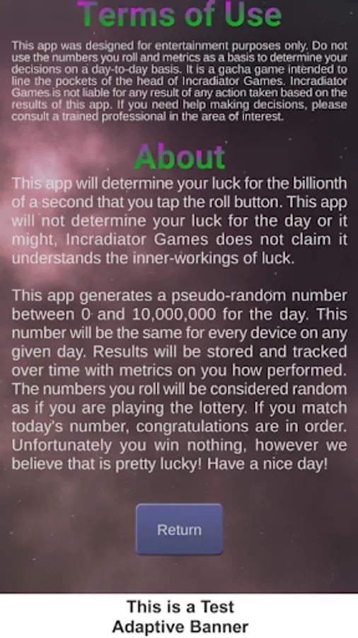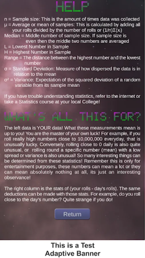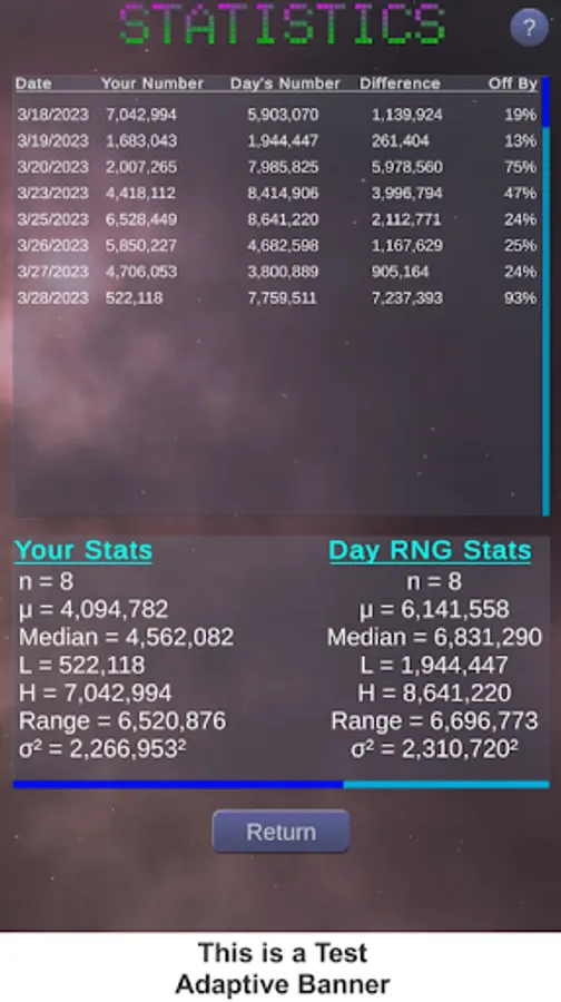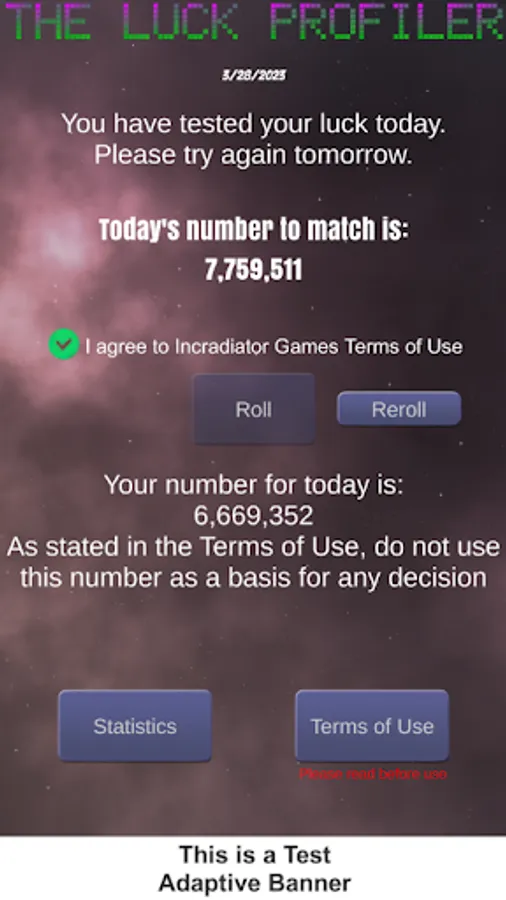 This app generates statistics based on your luck! Roll a number between 0 and 10,000,000 and compare it against the daily pseudo-randomly generated value. This app calculates the mean, median, Range, standard deviation, and variance of your rolls over time and compares it to the RNG. Do you feel lucky!?