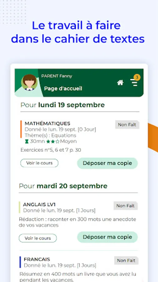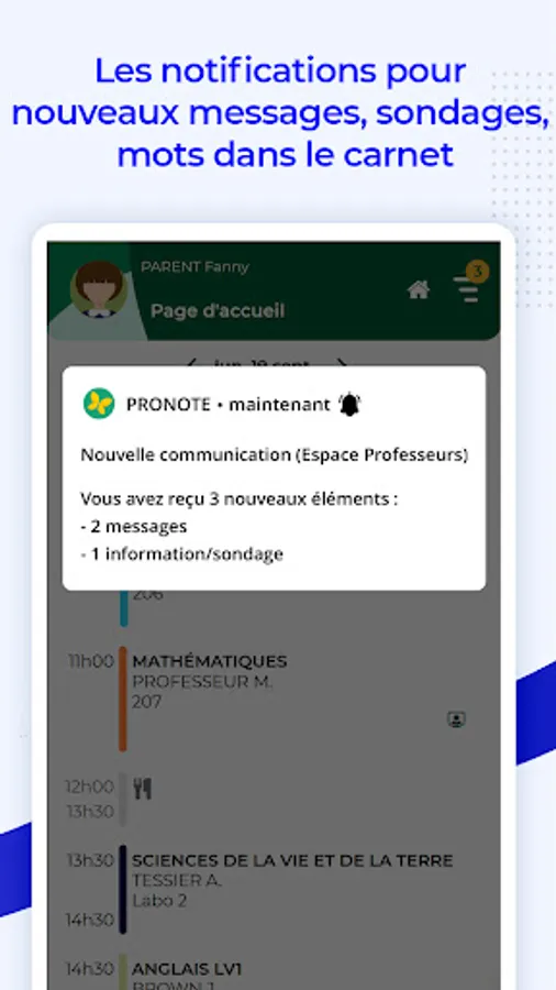 PRONOTE mobile is also contextual messaging that links all the actors of the institution: every event is announced by a notification (message, information and surveys, digital locker, etc.) for everyone’s benefit.