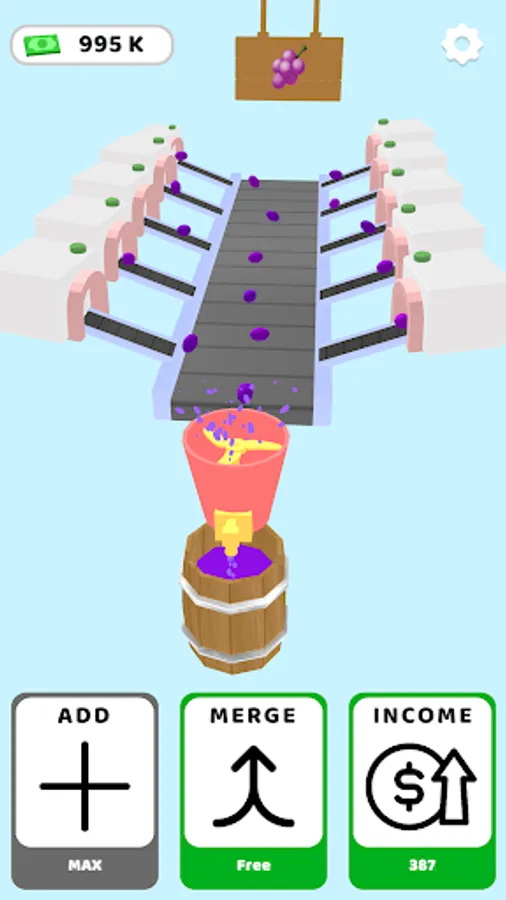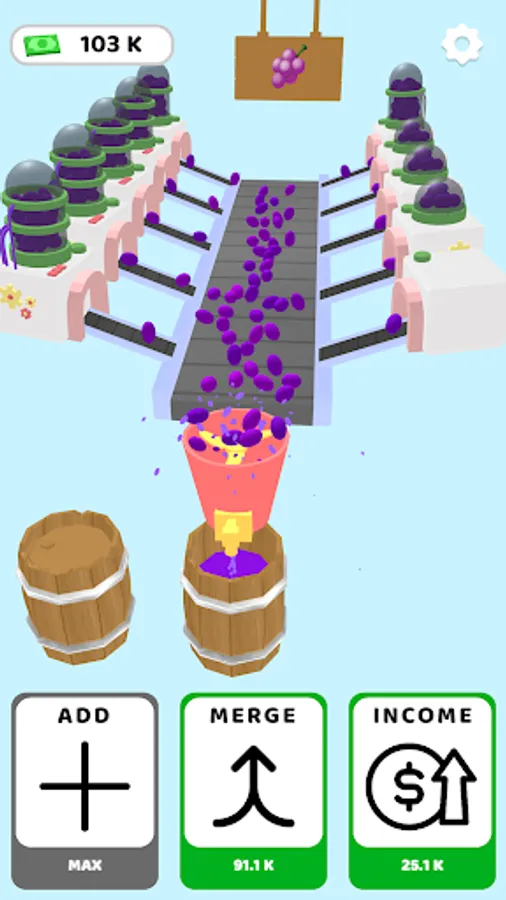 Grape Factory Idle is a casual simulation game where you build and manage a grape juice factory with just a few clicks. You start by harvesting grapes, then squeeze them to produce juice, and finally bottle and sell your products. As you progress, you can upgrade machines to increase your production speed and profits. Your goal is to become the ultimate grape juice tycoon by expanding your business, unlocking new achievements, and beating your high scores. Get ready to tap, collect, and grow your grape juice empire!