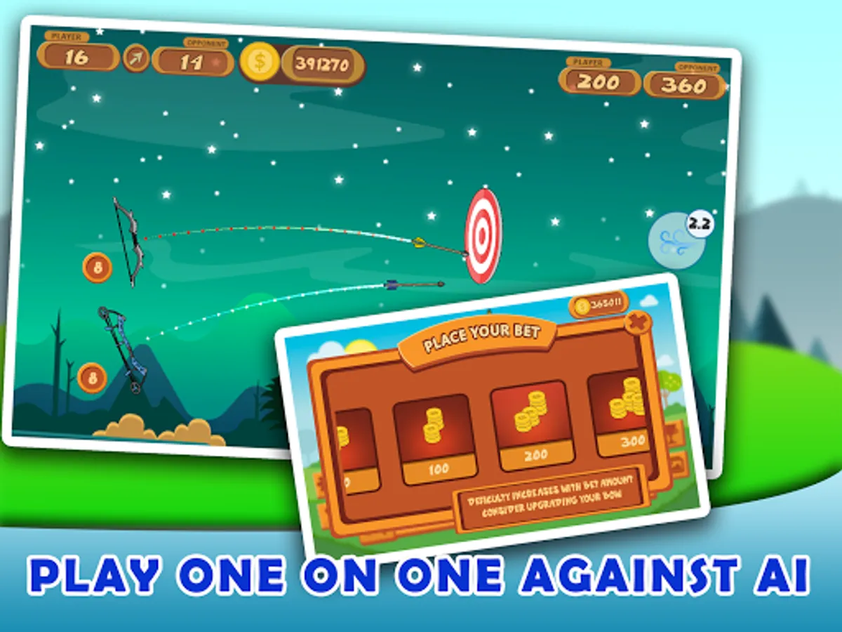 Compete against our AI players and win coins to purchase exciting bows and arrows. This bow and arrow game will be an unforgettable adventure and will give a real life archery combat feel.
