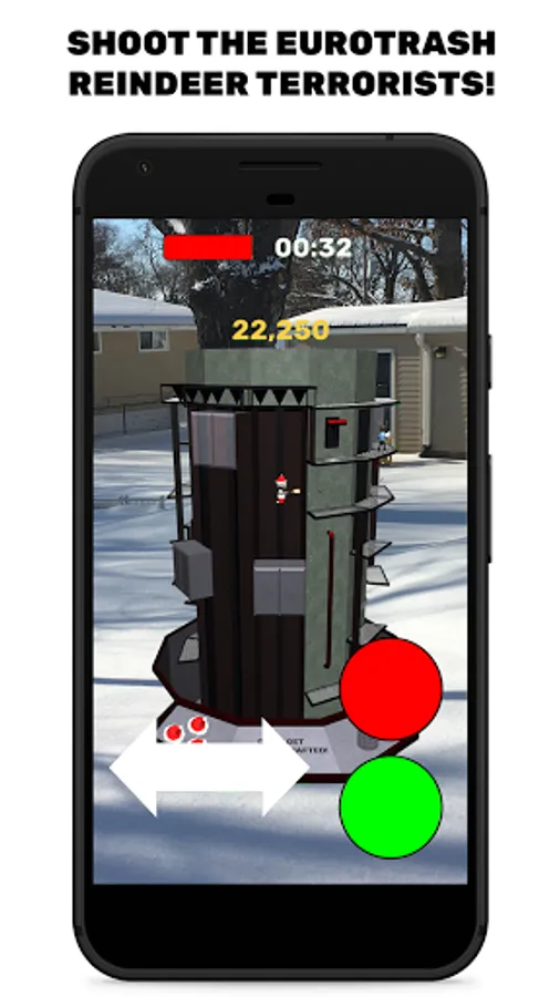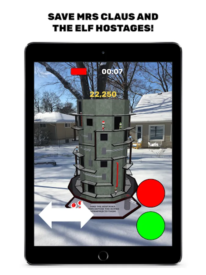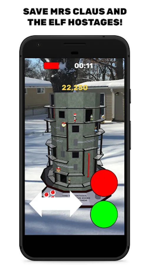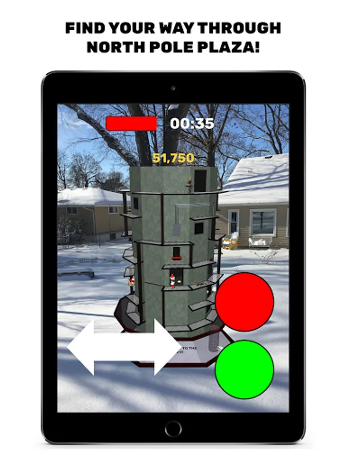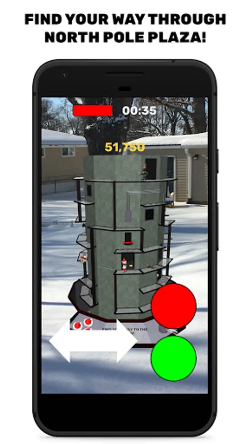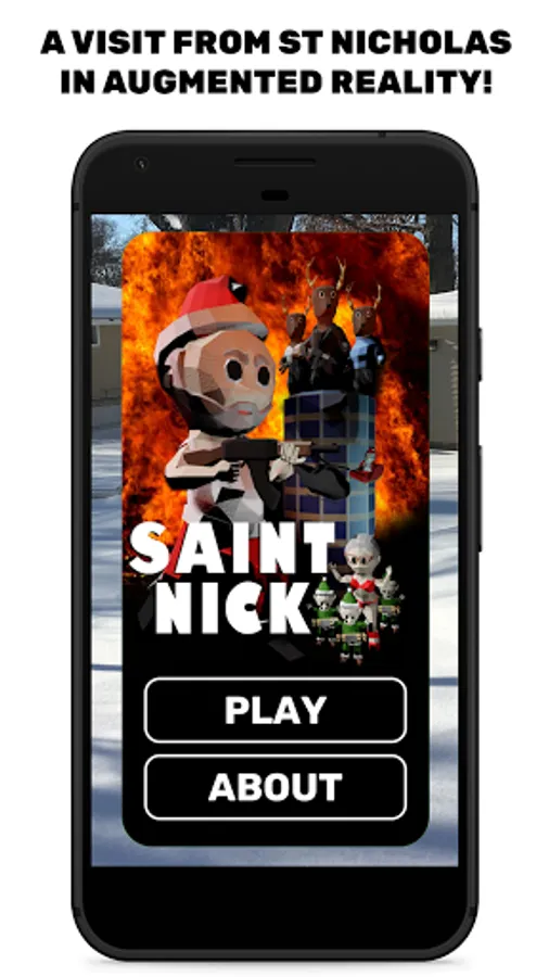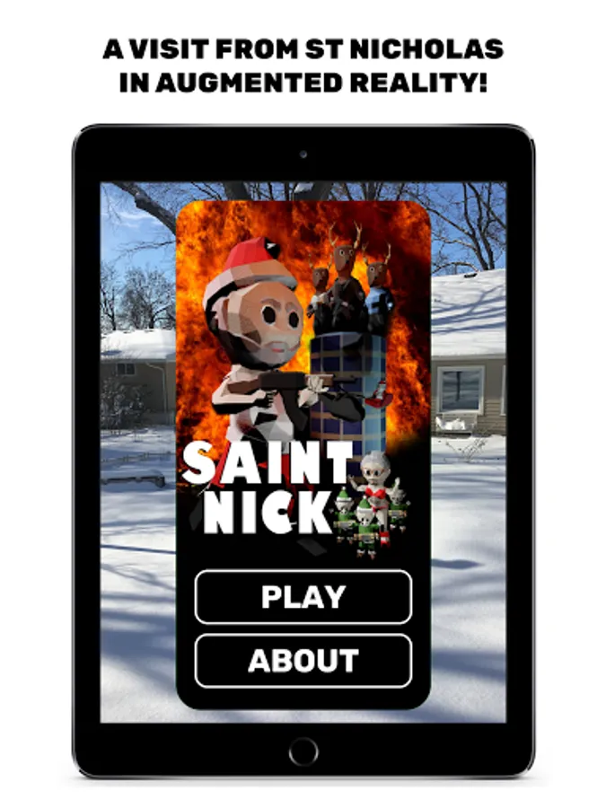 Saint Nick is an Augmented Reality game - North Pole Plaza appears in the physical space in front of you. Your device needs to be compatible with AR Core, and you'll need to play the game in a well-lit area where your camera can get plenty of information about the area around you.