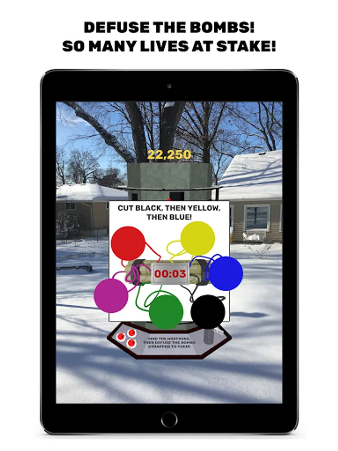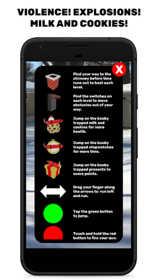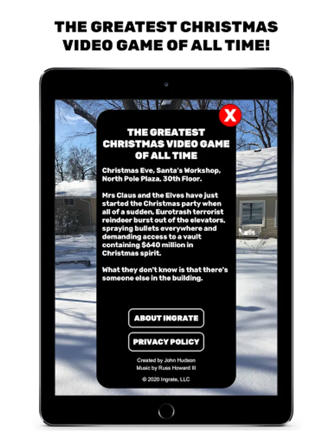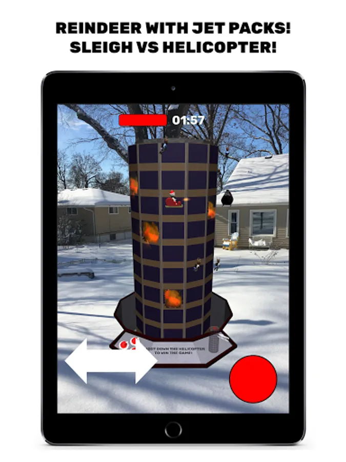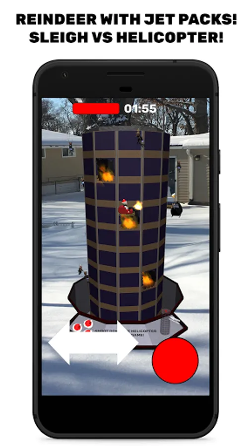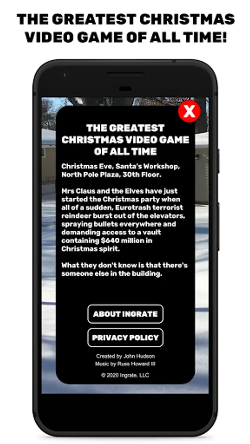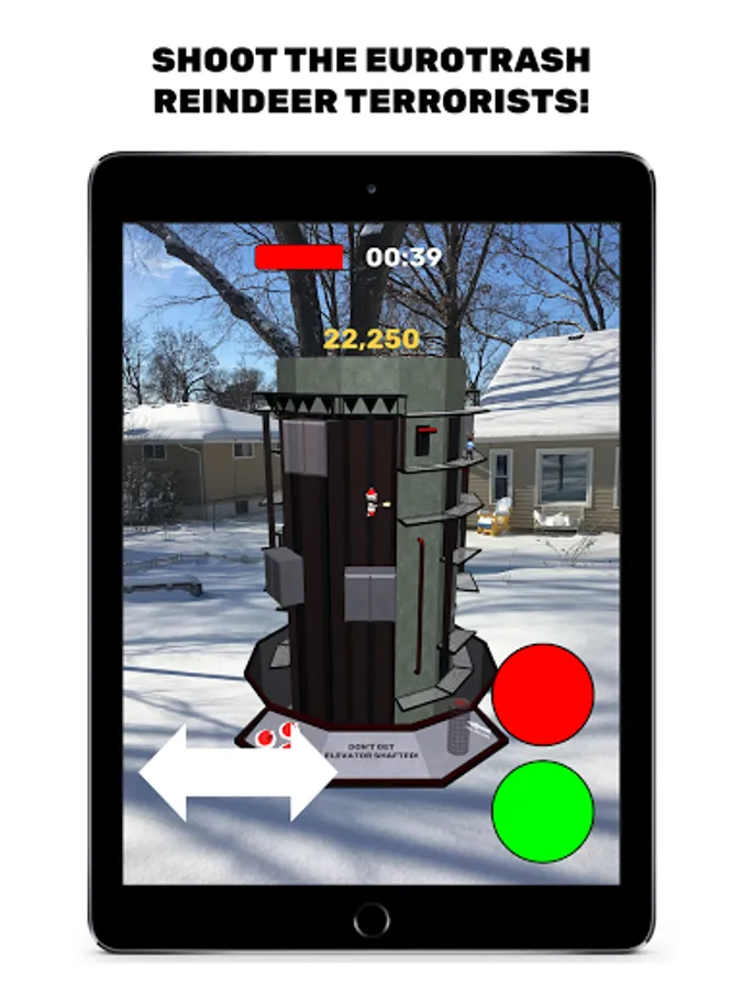 Saint Nick is an Augmented Reality game - North Pole Plaza appears in the physical space in front of you. Your device needs to be compatible with AR Core, and you'll need to play the game in a well-lit area where your camera can get plenty of information about the area around you.