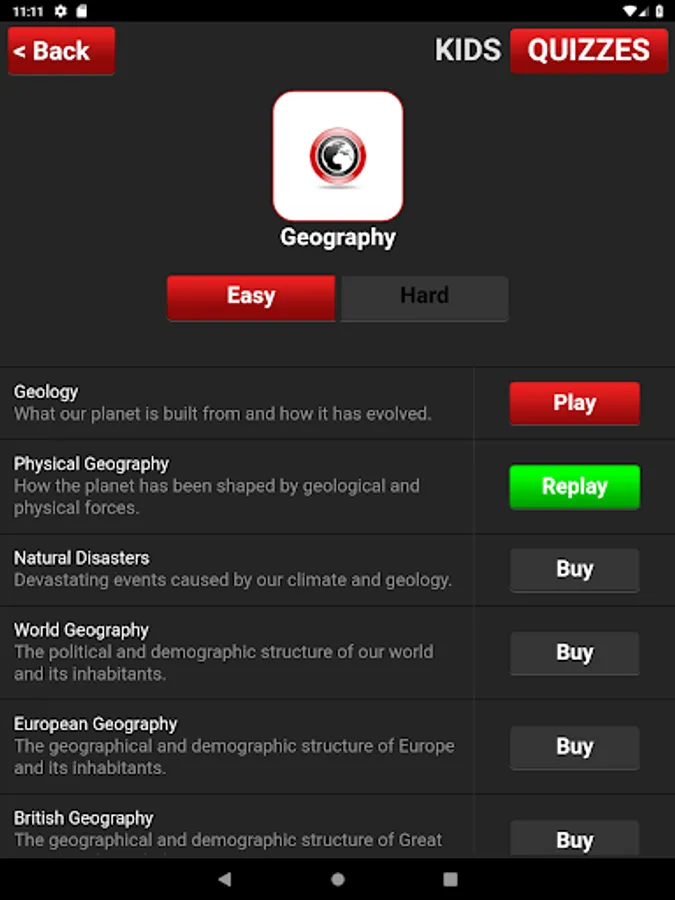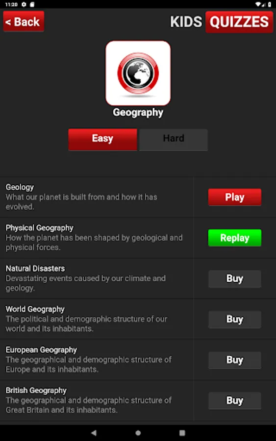 - 2 different difficulty levels: Easy (age 7-11) and Hard (age 11-16)