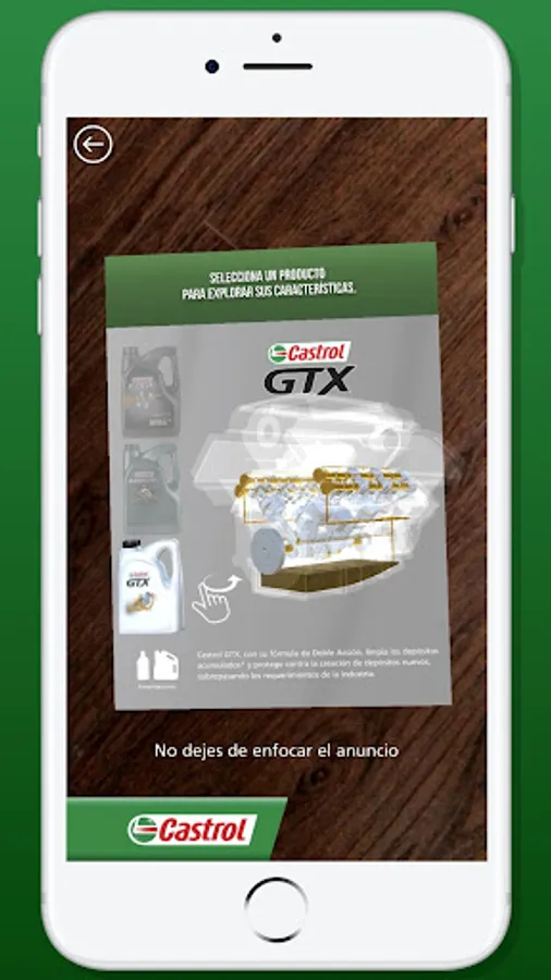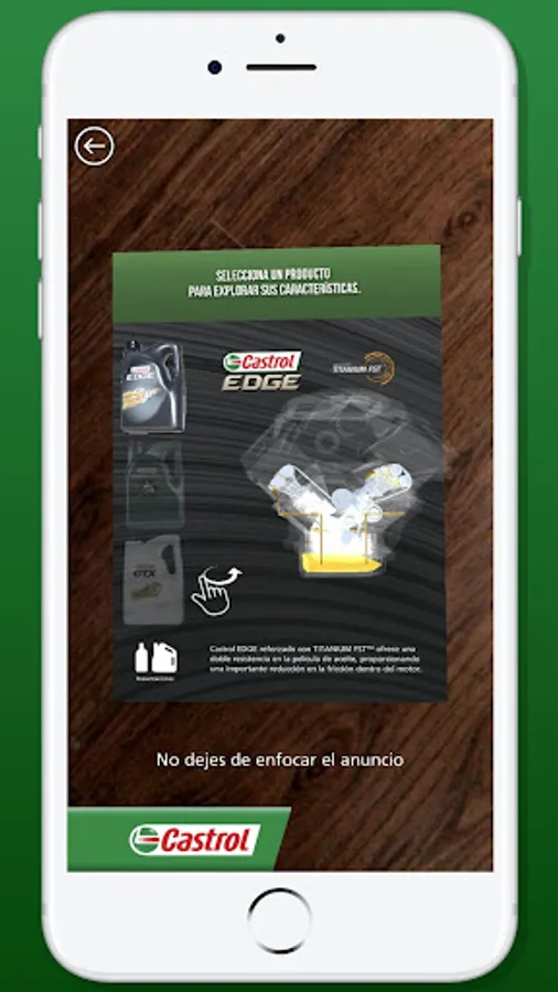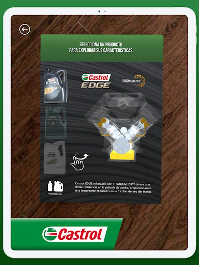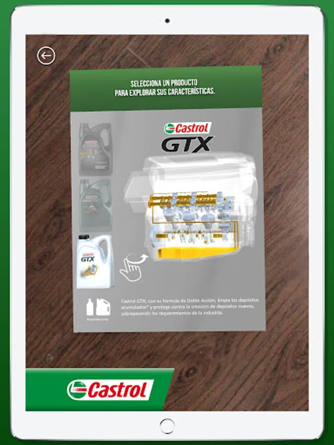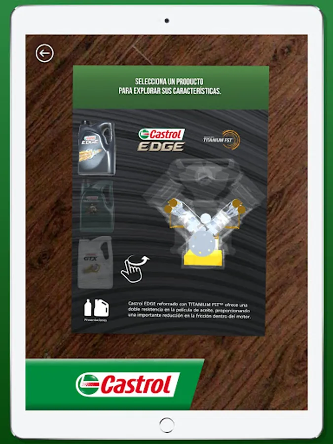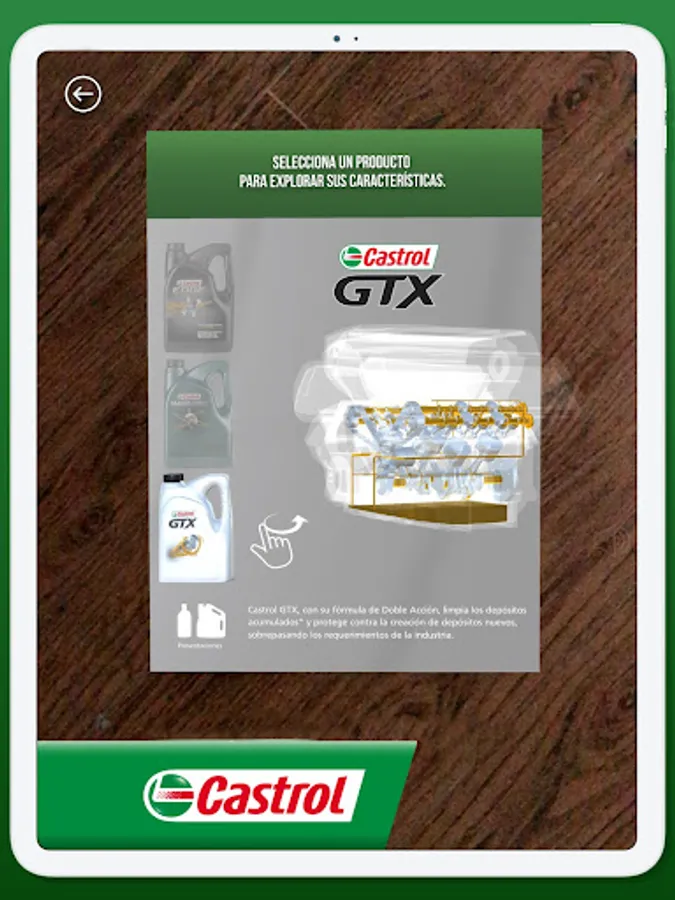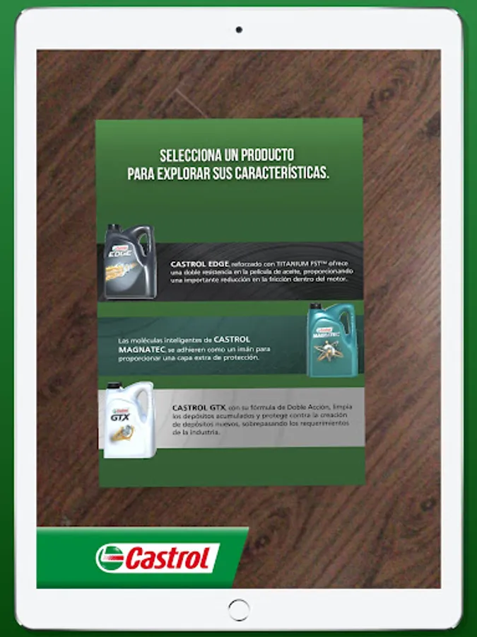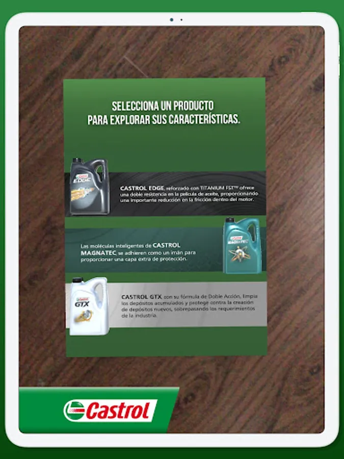 CASTROL DEVELOPED THIS APP OF REALITY INCREASED WITH THE OBJECTIVE OF HELPING THE MECHANIC TO DIDACTICALLY INFORM THE DIFFERENT PROBLEMS THAT THE MOTORS ARE SUFFERING TODAY. THIS APP SIMULATES THE DIFFERENT PROBLEMS THAT THE ACTUAL ENGINES ARE PRESENTED BY THE ENGAGEMENT OF EACH ONE OF ITS PRODUCTS IN ITS DIFFERENT SITUATIONS, ALREADY CLEANING THE DEPOSITS AND PREVENTING NEW WITH CASTROL GTX, PROTECTING FROM THE START UP AND MAINTAINING THIS PROTECTION DURING THE DAY WITH CASTROL MACNATEC OR THINKING ABOUT THE MOTORS AND PERFORMANCE WITH THE MOTORS POINT WITH CASTROL EDGE, PROMOTING THE RIGHT USE OF EACH OF OUR PRODUCTS.