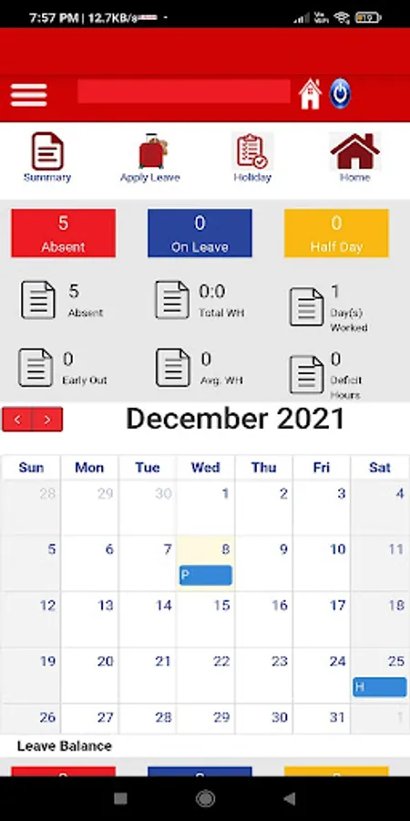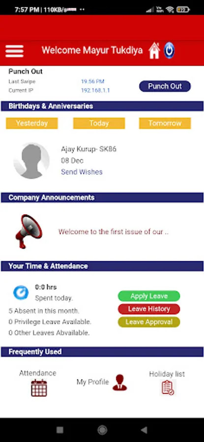 The user is given the facility to punch in and punch out from the app, view his last login and logout time and check his attendance calendar. The user can apply for leave from the app and the manager can approve their leaves from the app also. The user can view his leave balance and historical leaves under leave history option .They can also view their historical salary slips