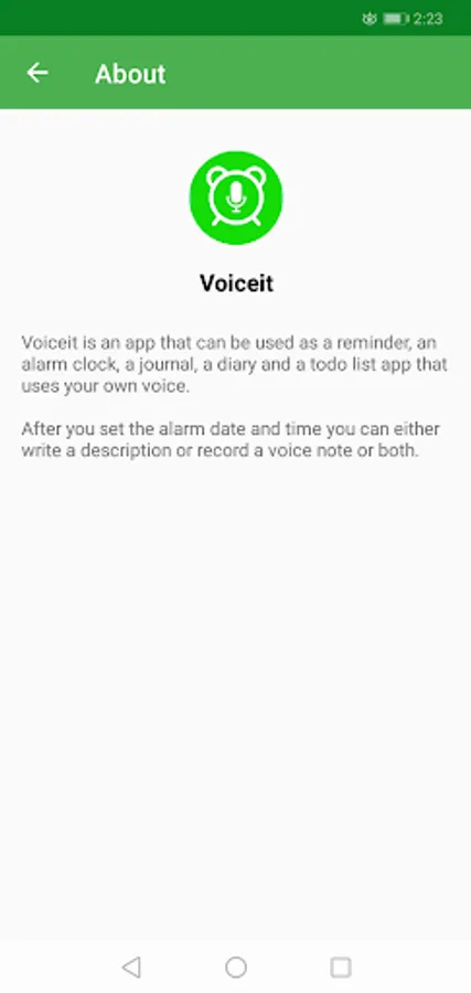Voiceit is a quick recorder of ideas that can be used as a reminder, an alarm clock, a diary and a todo list app.