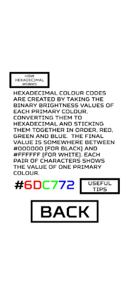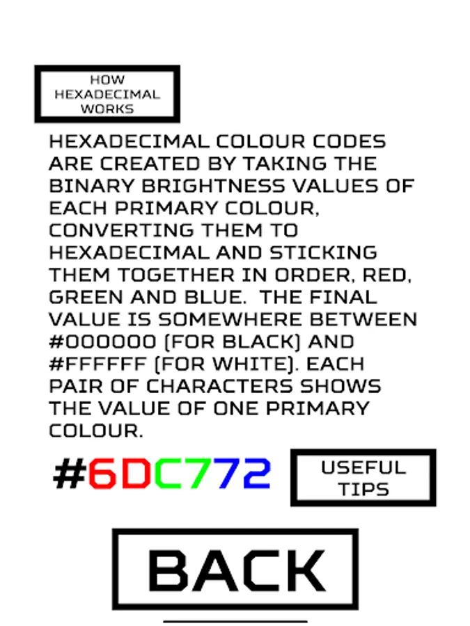 Do all the codes look like random gibberish? Hexaguessimal comes with a short tutorial explaining computer colour and how hexadecimal colour codes are used to show colour.