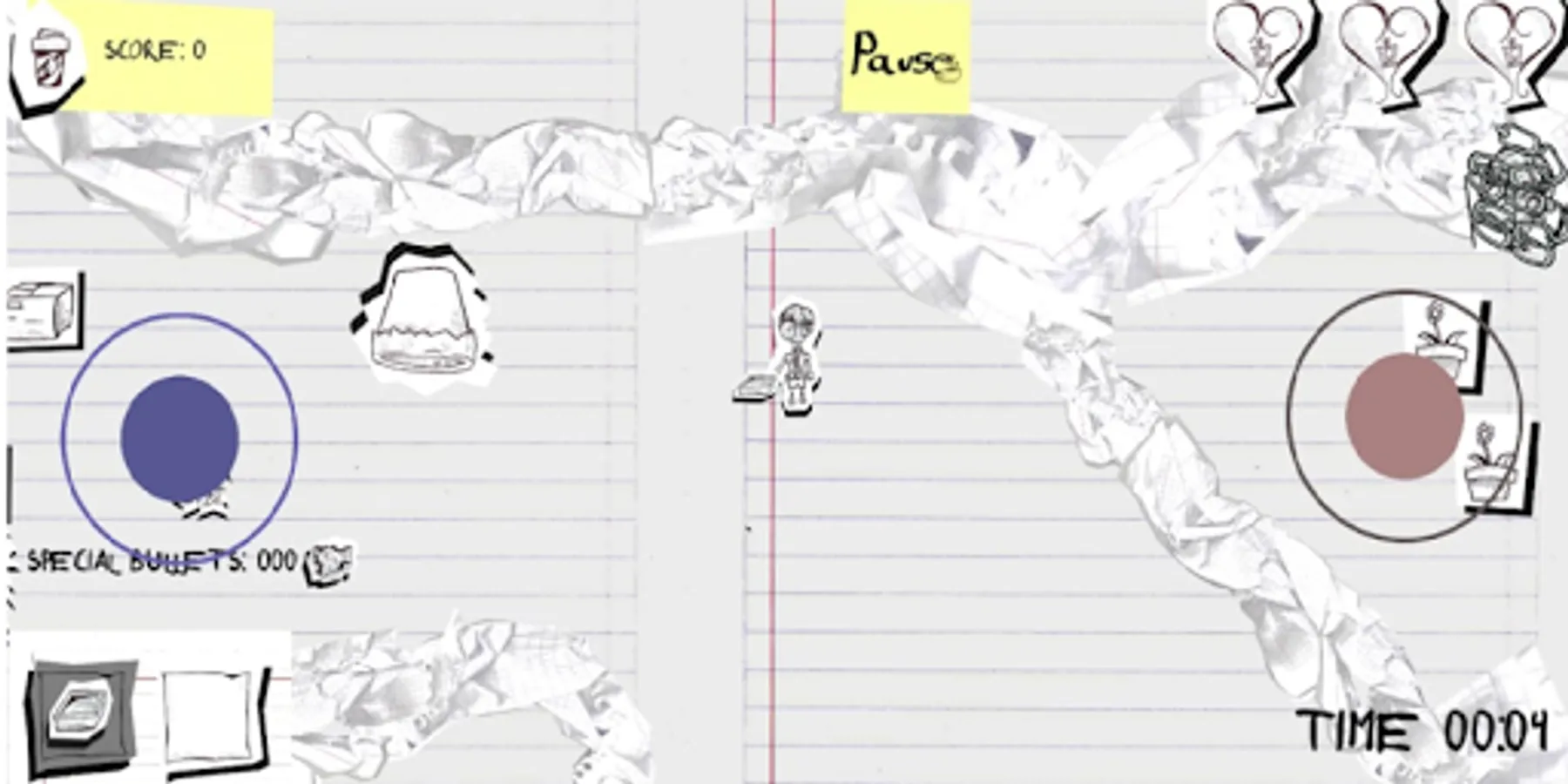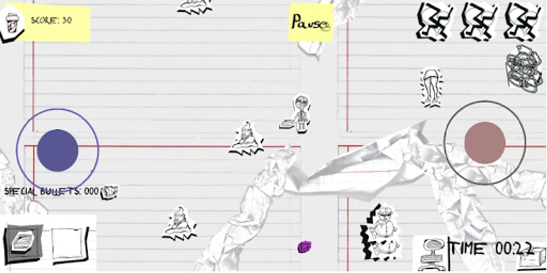 A 2D-Top Down shooter, with frenetic action and CRAZY bosses in an office notebook