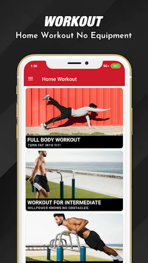Arms workouts help you to add size and strength to your biceps and triceps while also building a bigger and stronger chest with this four-week workout plan. Chest workouts help you to build a bigger, more powerful chest with these insanely effective, expert-approved chest moves. Abs workouts help you to A six-pack may be hiding underneath a few inches of fat. The right process requires you to reduce your overall percentage of body fat through a workout routine that will develop your overall core strength and function. Legs workouts help you to The most experienced trainers will help you to get strong legs, improve leg muscles and lose leg fat. Shoulders & back workouts help you to Build strength and an impressive V-taper with the killer back and shoulder workout from Home Workout for Men app.
