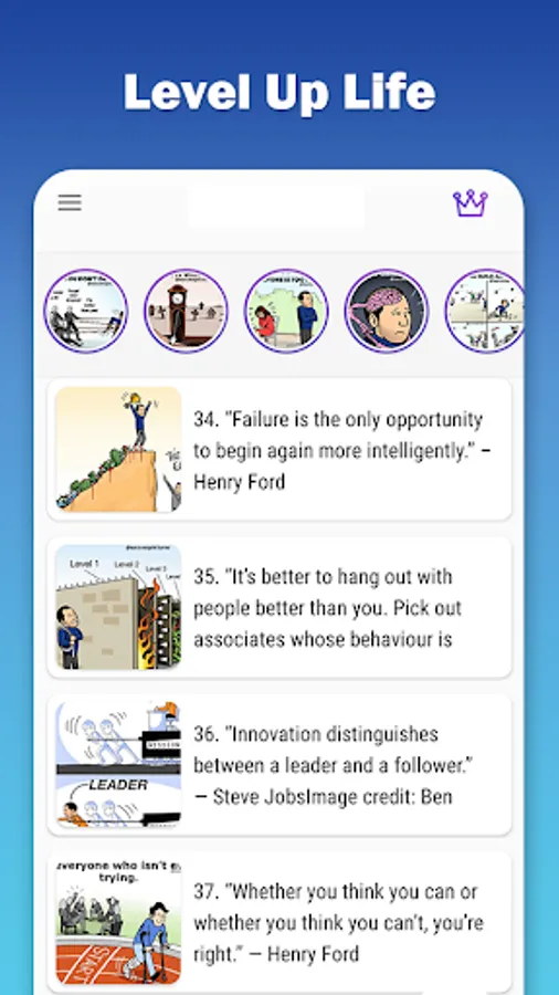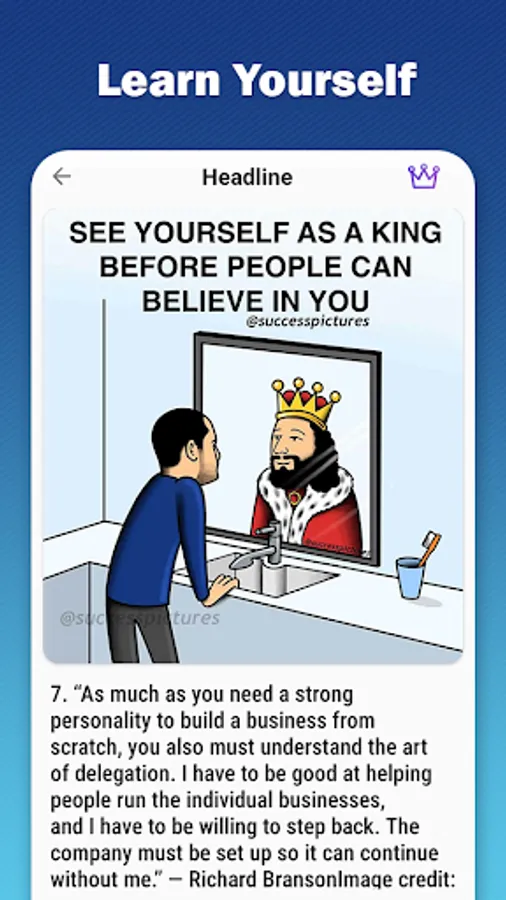 Personalized content & feed. Choose a few topics of interest (like self improvement, Personal Development, Development Goals, Billionaire & Success Tips, Aspiring Successful Entrepreneur, time management, problem solving, love & relationships & more) and then just use the app at your leisure. As you save ideas and use our app, we learn what you like and find the best stories and articles to show you every day, so you’re motivated and inspired. You don’t even have to work for it.