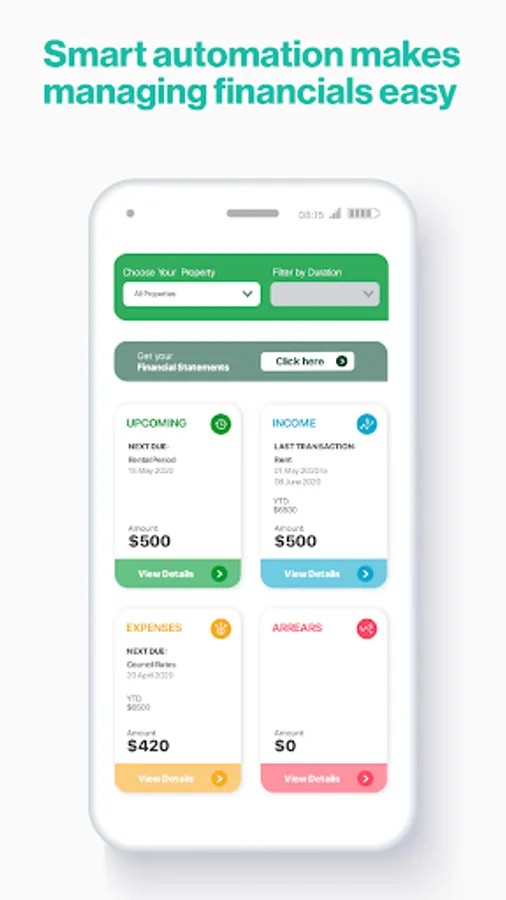Manage property finances including rent, repair invoice, bills, and access detailed property financial reports.
