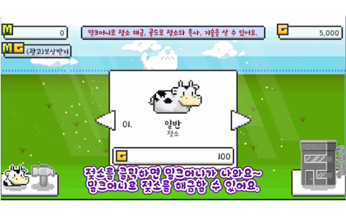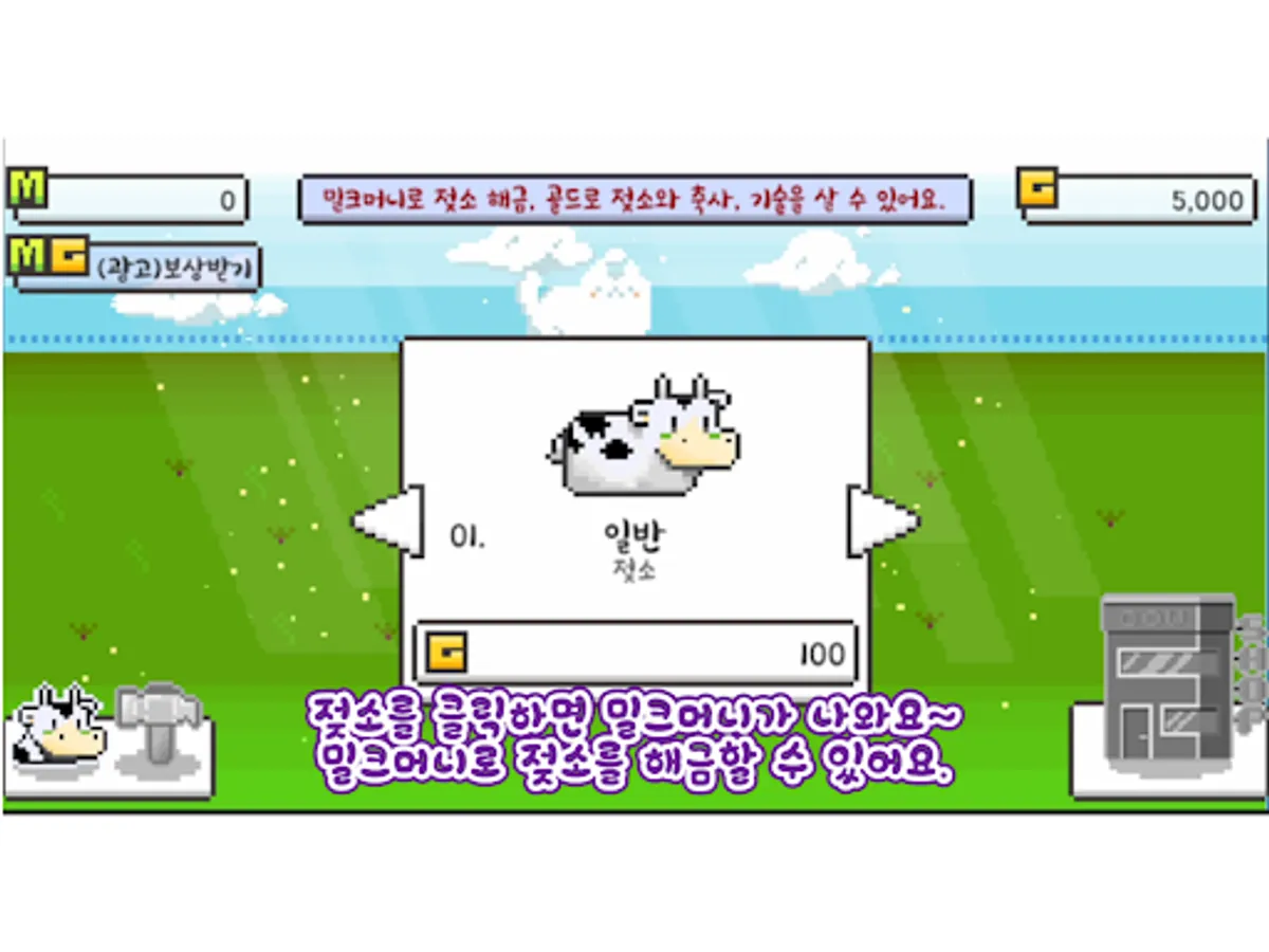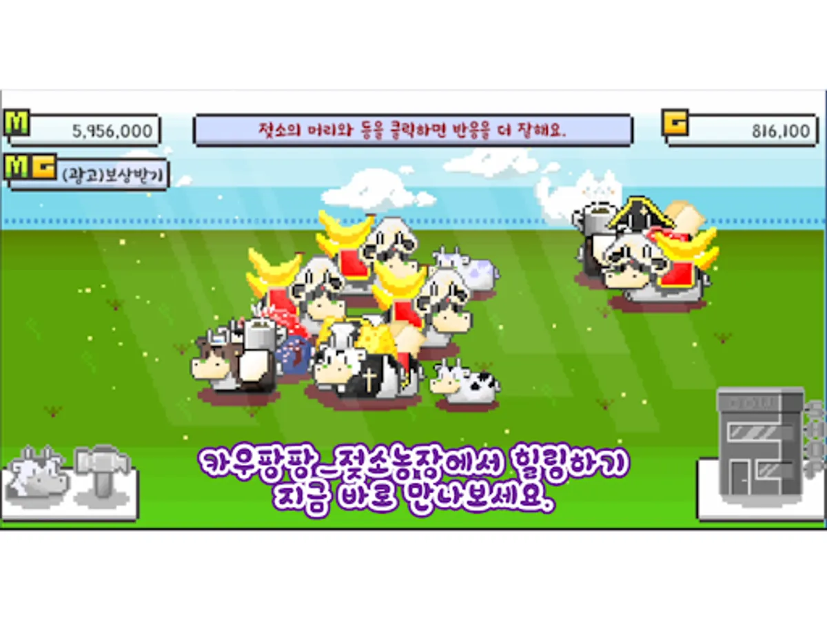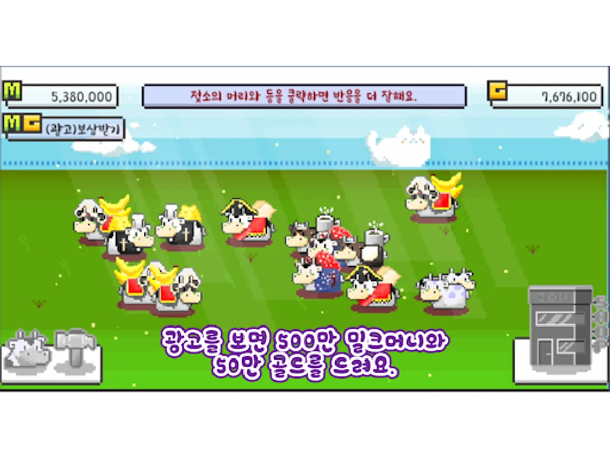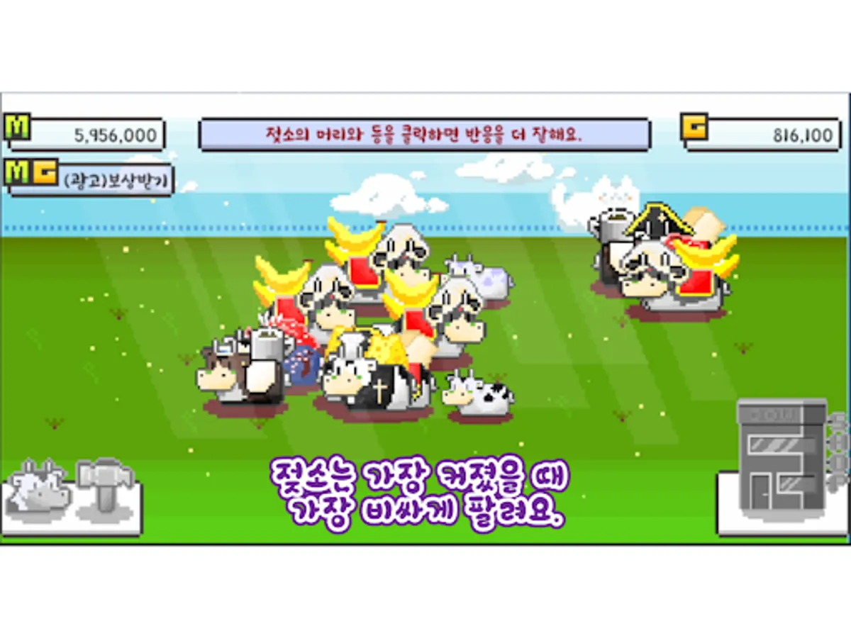 목장에서 젖소를 키우는 게임으로 젖소를 터치하면 밀크머니를 획득할 수 있습니다.