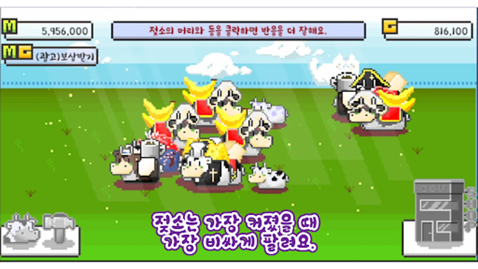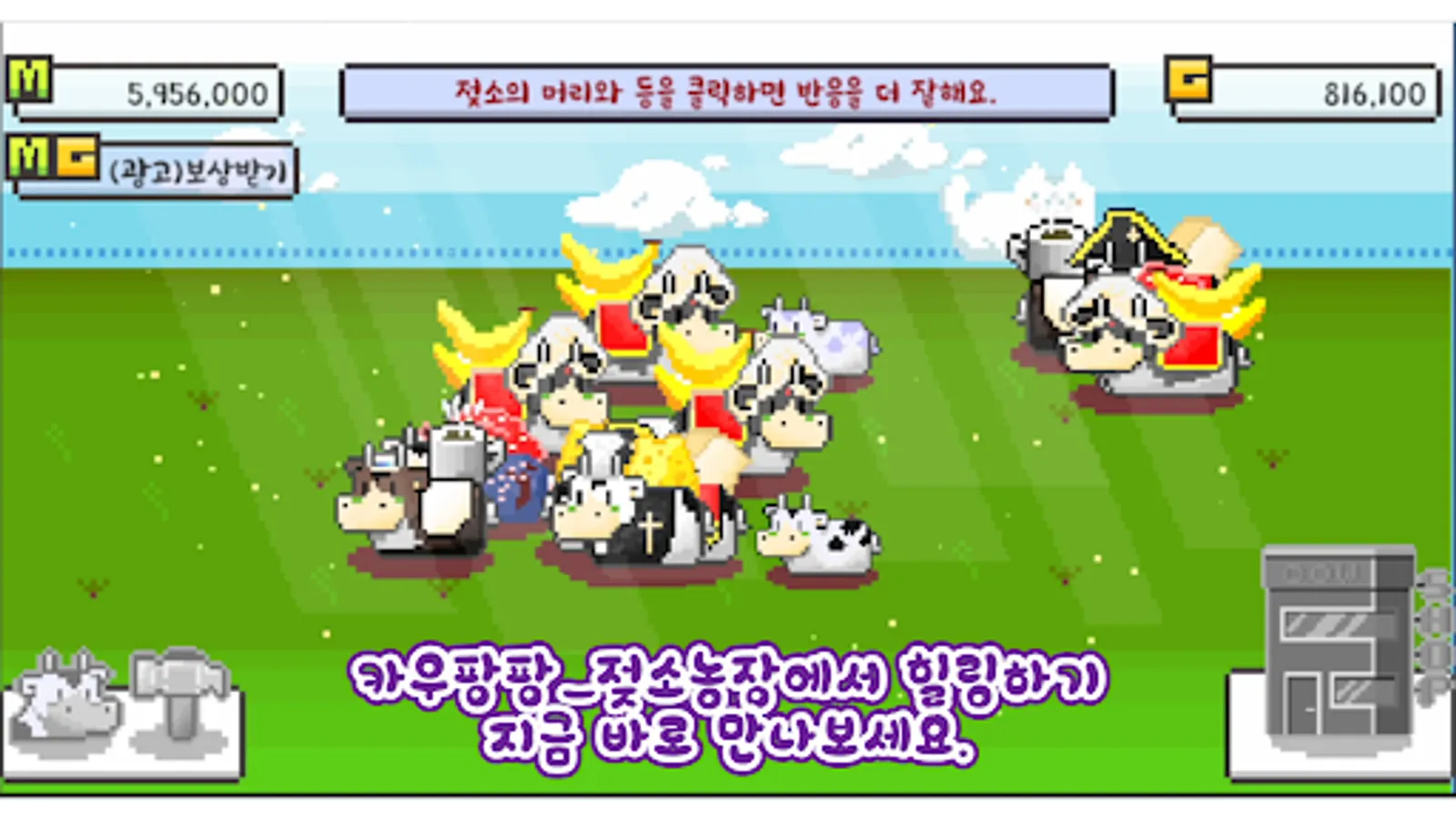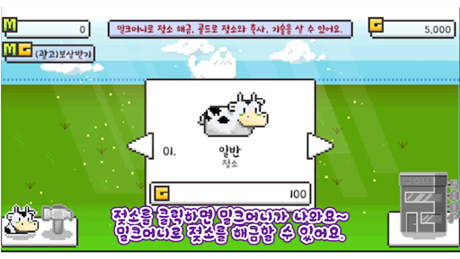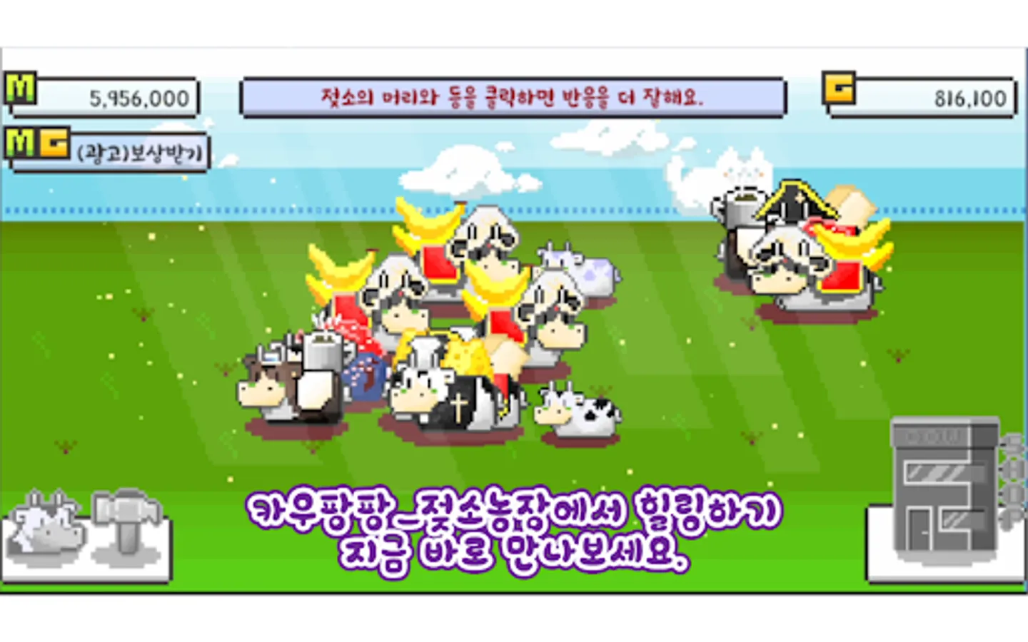 목장에서 젖소를 키우는 게임으로 젖소를 터치하면 밀크머니를 획득할 수 있습니다.