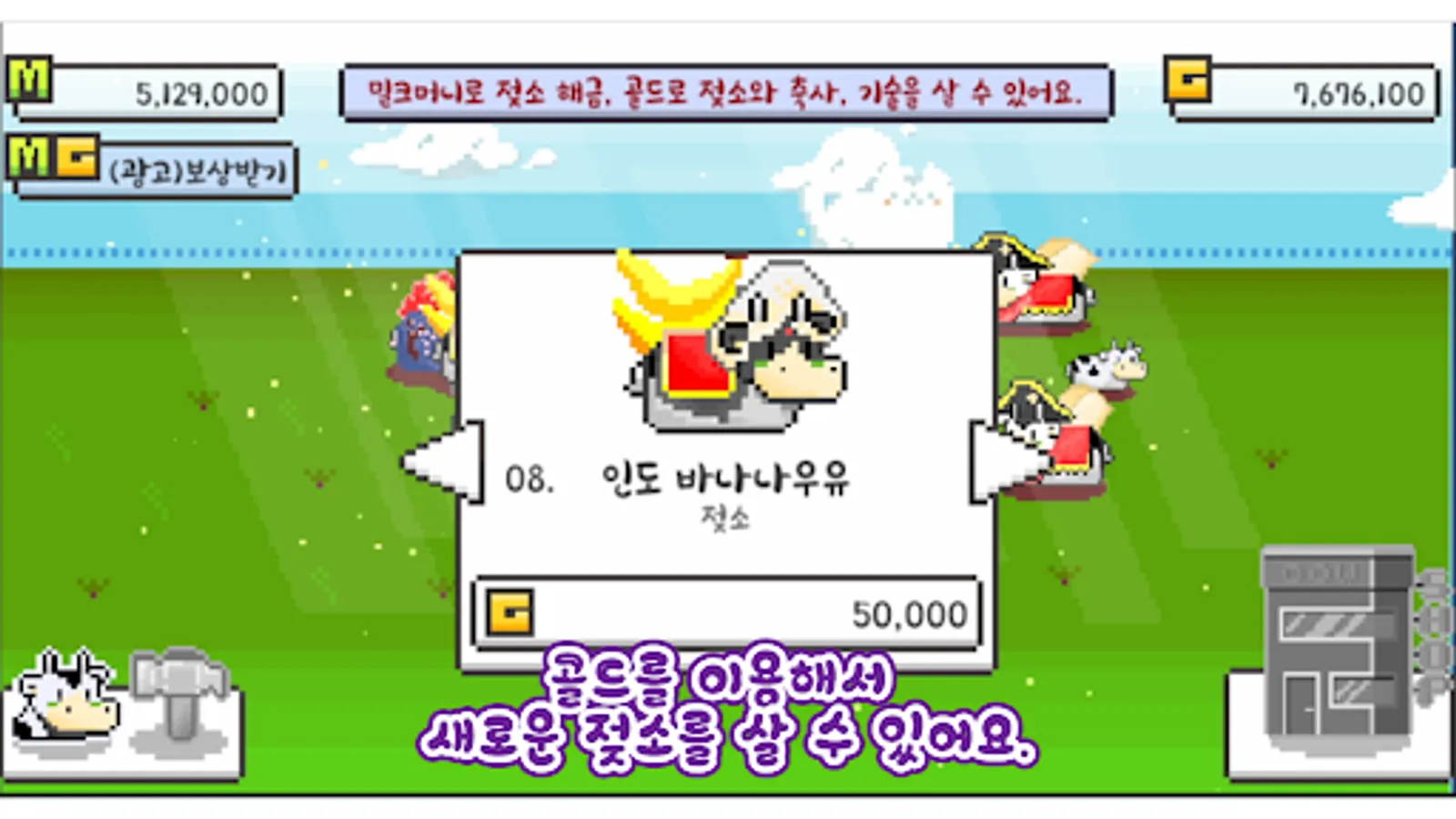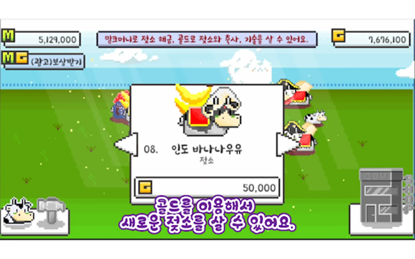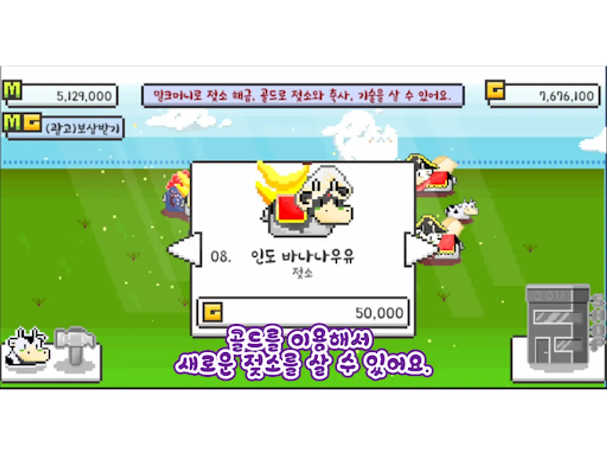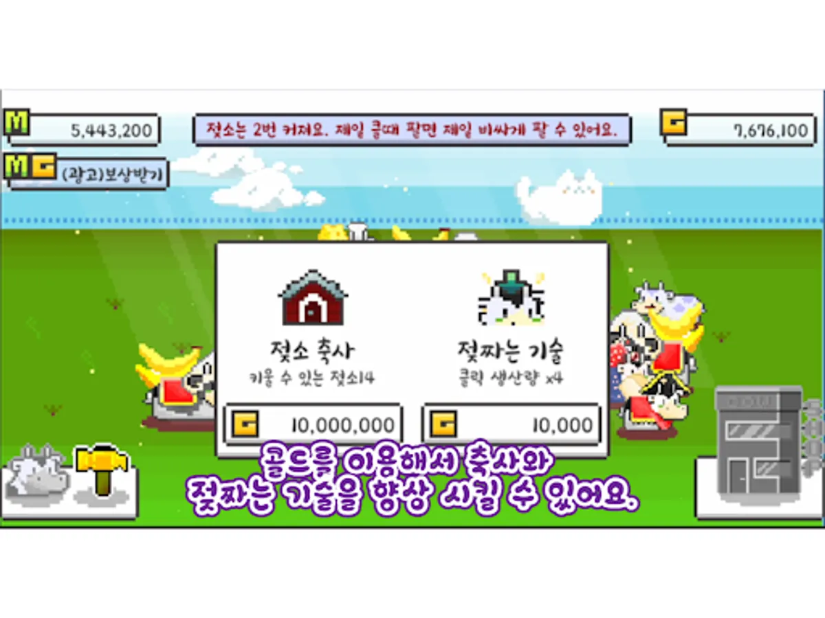 젖소를 팔아 얻은 골드로 새로운 젖소를 구매하고 소의 축사를 넓히고, 클릭 당 얻는 밀크머니를 늘릴 수 있습니다.