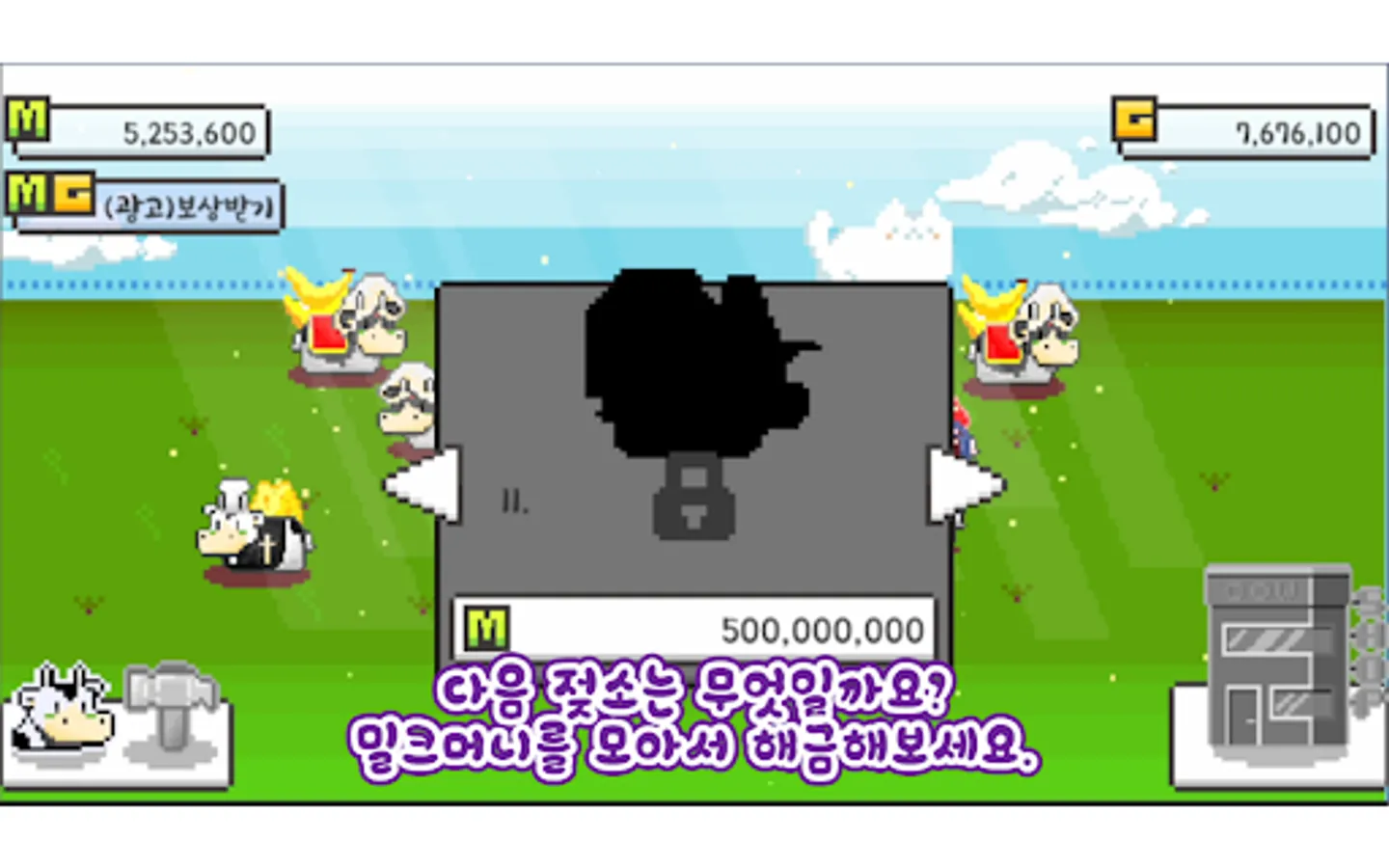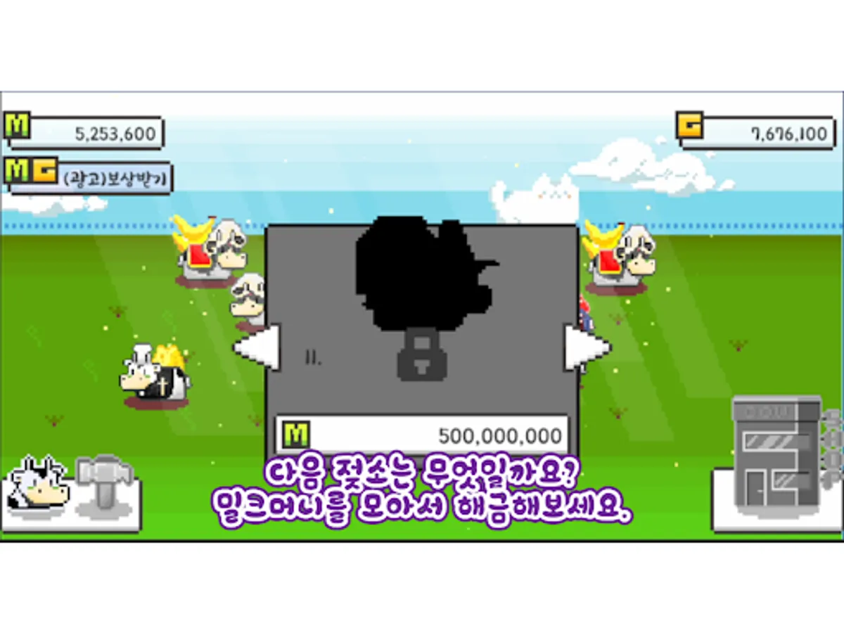 젖소를 클릭해서 얻은 밀크머니로 각 나라의 특색있는 젖소들을 해금할 수 있습니다.