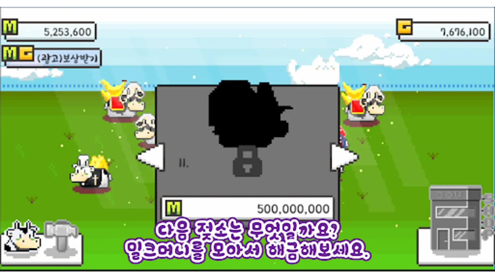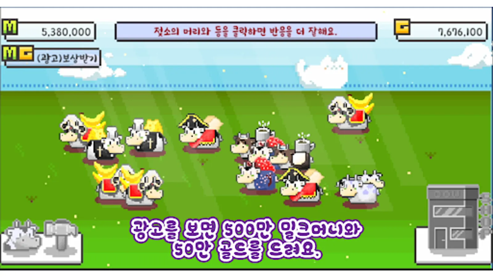 게임 중 광고를 시청하시면 500만 밀크머니와 50만 골드를 드립니다.