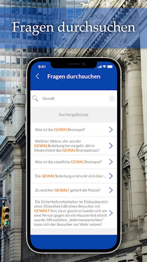 The app provides the following functions that prepare the user for the IHK expertise test in accordance with the regulation § 34a GewO and for the everyday professional life of a security employee.