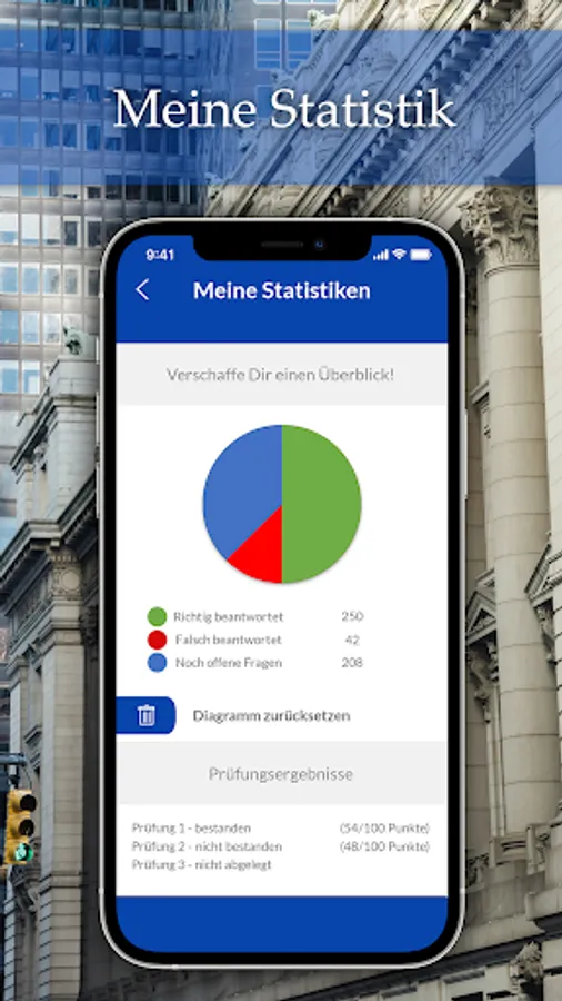 The app puts you in exam mode and lets you take an exam under the same conditions as you would find at the IHK. All of your exam results can then be found under “My Statistics”.