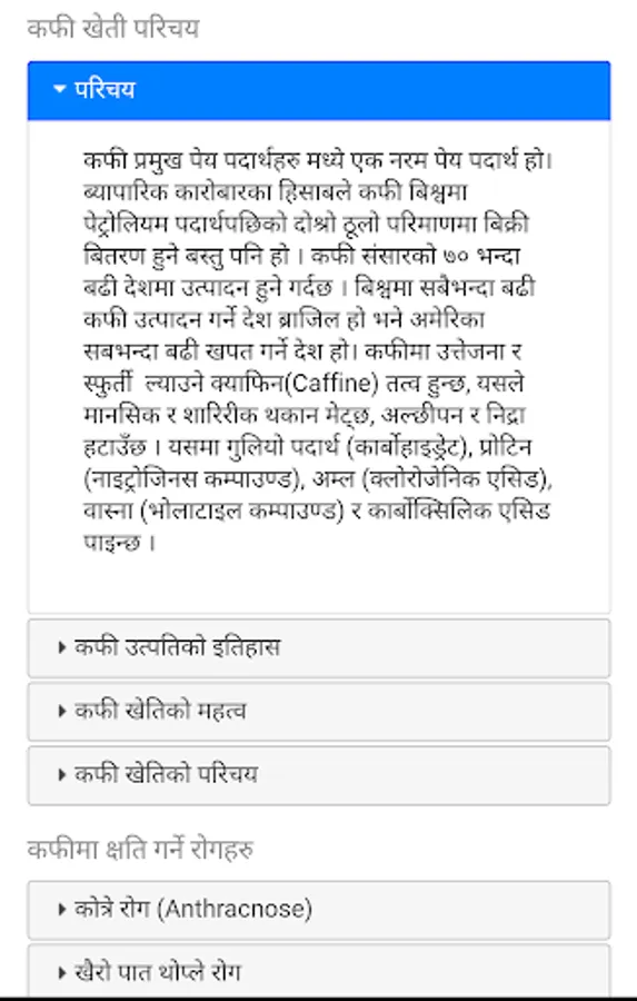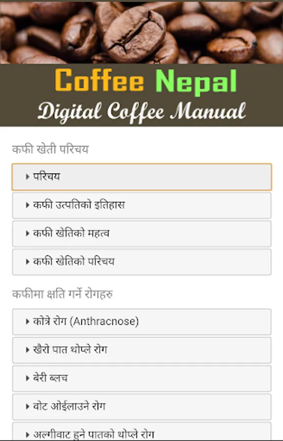 1) Supporting farmer for their coffee cultivation, management practices and pushing up-to date information regularly and frequently to their handled device. The best innovation with our system is, once App user gets online, all the content will be downloaded to their mobile apps for offline reading. So that, farmer do not need to update every page one by one.