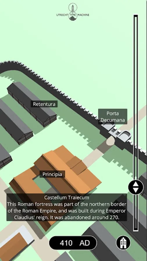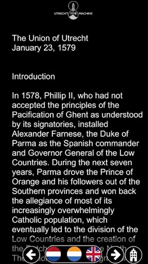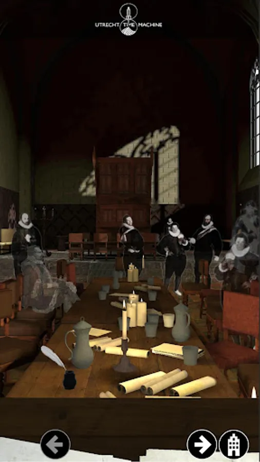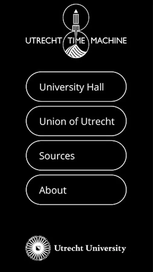 The UTM - University Hall app is the first prototype of the Utrecht Time Machine project. The app allows the user to travel back in time and visit the past. Besides looking into the development of the Domplein University Hall area, the University Aula, former Chapter House can be visited. In this hall the Union of Utrecht document was signed on January 23rd 1579.