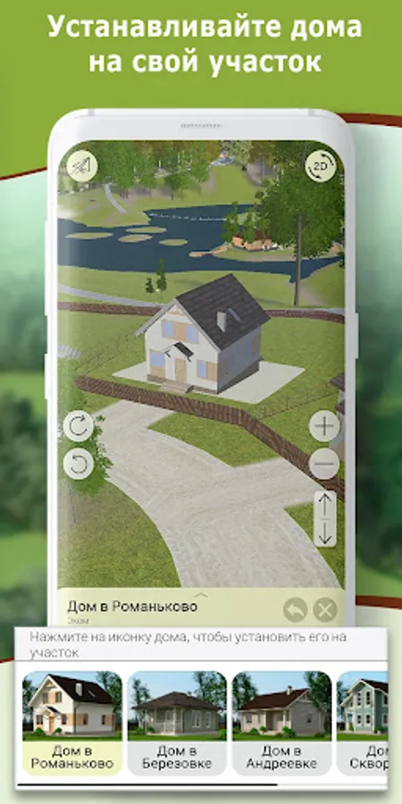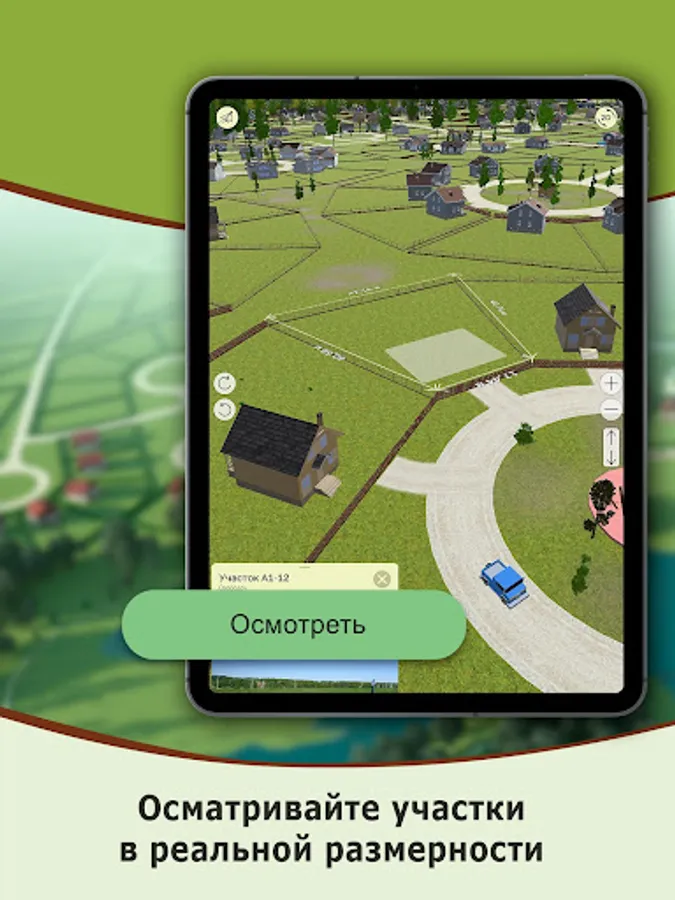 All data sites are relevant and updated in the application. You can change the methods of inspection of the site from 3D to 2D mode. A special mode of inspection of the sites is the flight mode of the gyroscope. It will allow you to explore the village 360 ° from any point on the territory of 5 km².