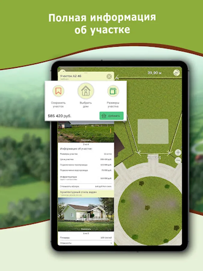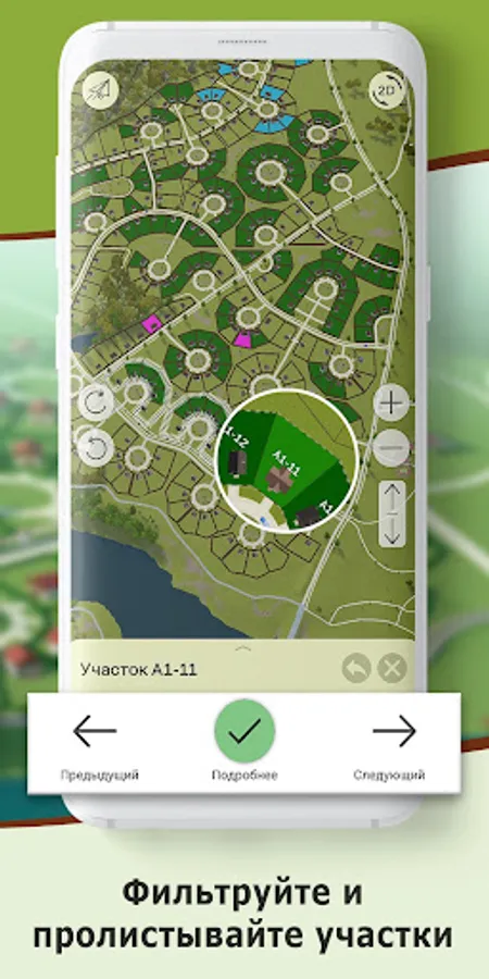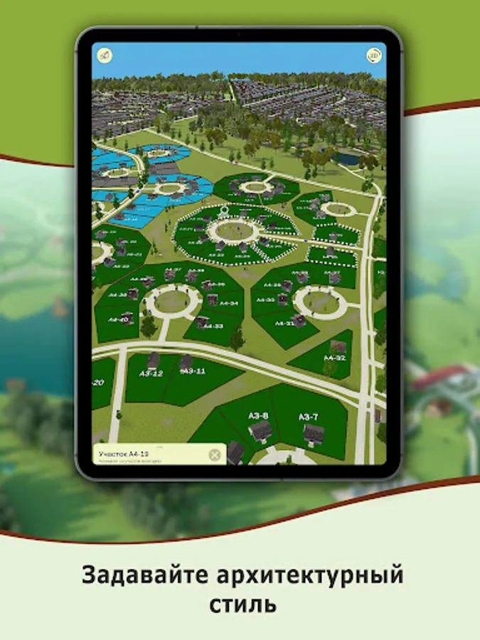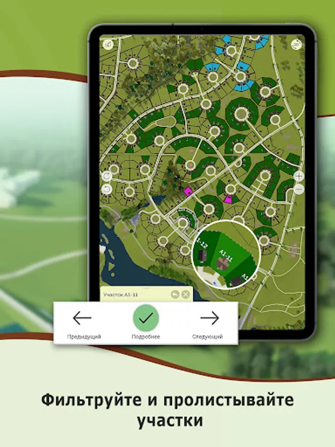 Choose a site on the general plan or by filters, receiving complete and current information. Set the model of the house on the site and determine the architectural style of your quarter.