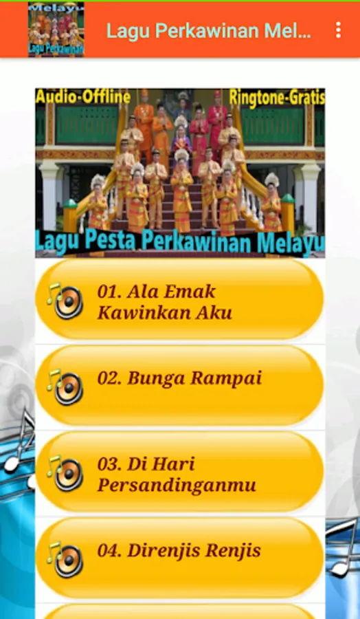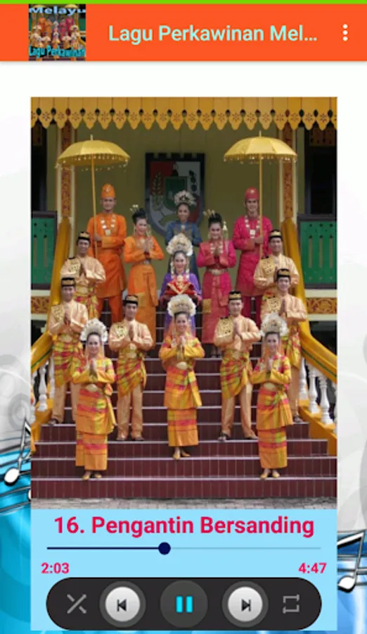 The Malay Wedding Party song contains the best and most popular collection of Malay songs that are often sung at Malay traditional wedding parties such as the Bride and Groom, Bride Host, On Your Match Day, If There is a Mate, etc. Presented in the form of quality offline mp3 audio. Install and enjoy the melodious sound of Malay singers in accompanying a Malay traditional wedding party.