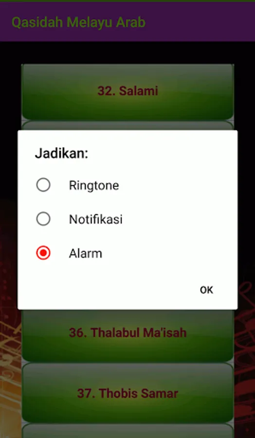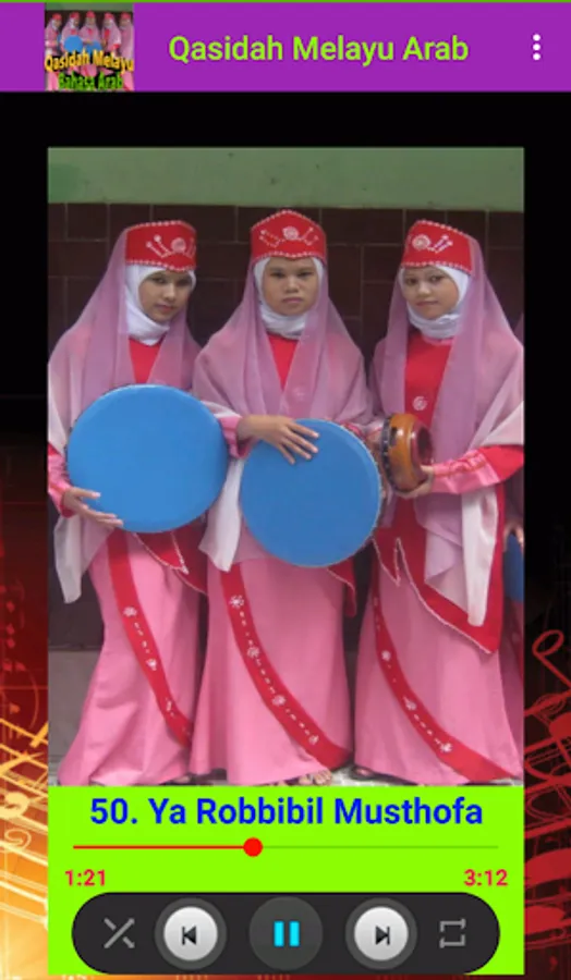 The Arabic Malay Qasidah song contains the most complete and best collection of Arabic-language Kasidah Songs by the most popular Malay Qasida Orchestra. Install and enjoy the beauty of qasidah music with Arabic songs such as Amam Wardhatul Jamal, Ash Shalatu 'Alan Nabi, Ibda' Binafsik, Ya Robbibil Musthofa, etc ... This application is perfect for fans of Islamic Malay culture. Each song can still be enjoyed even without an internet connection. Can also be used as a Ringtone, Alarm, or Notification.