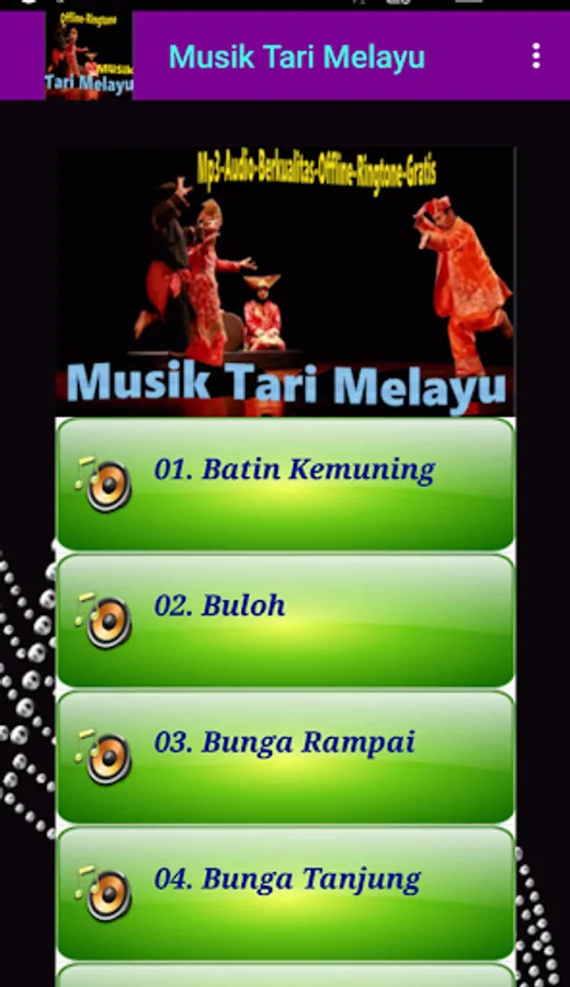 Malay Dance Music contains the best collection of music from the leading and most popular Malay dances such as Zapin Kasih and Budi, Sekapur Sirih Seulas Pinang, Makan Sirih Patam Patam, Rampai Flowers, etc. Please install and enjoy the melodious music that is usually used for Malay dance. Install and enjoy the best experience of Malay dance music on Android gadgets. Can still be enjoyed even if you are not connected to the Internet. Can also be used as a Ringtone, Notification, or alarm.