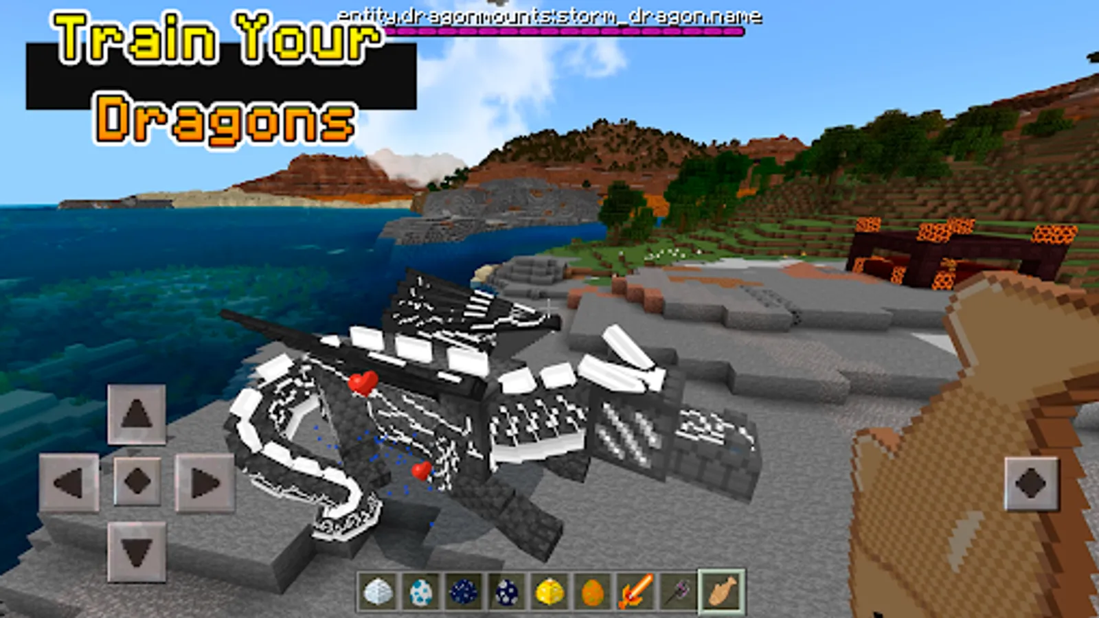 All the dragons in the application Dragon Mounts mod except the ghost dragon have their own custom armor, sword, and scale. To equip the armor, long press on the screen, or right click. You can also equip a saddle, chest, and horse armor on the dragons. All of them have a hostile and tameable version. The tameable versions are not flying. All mobs drop scales.