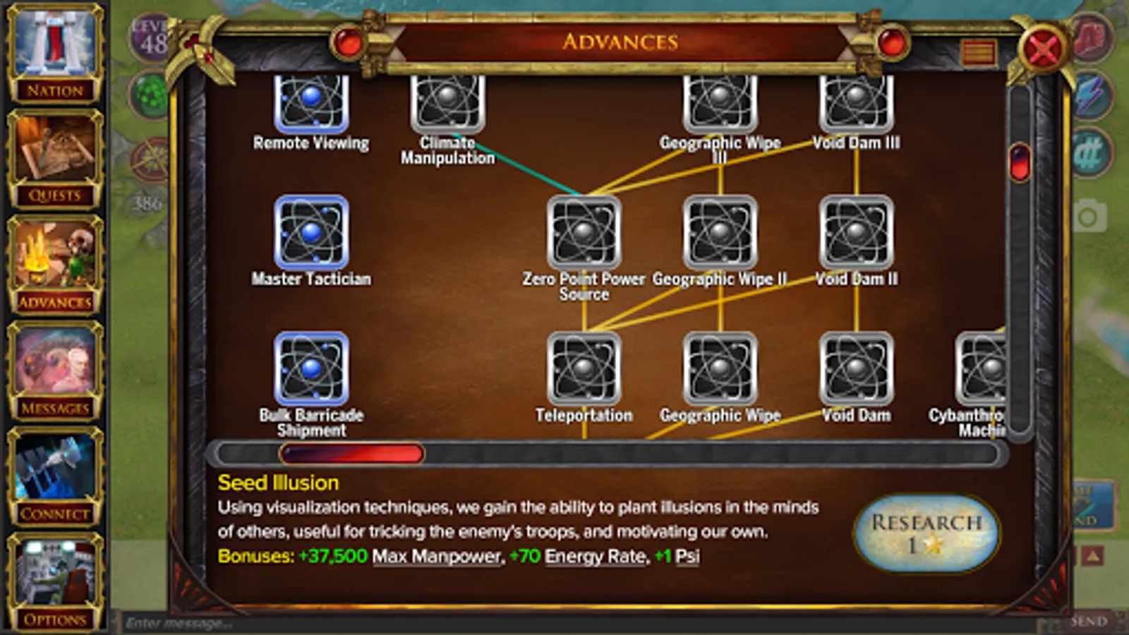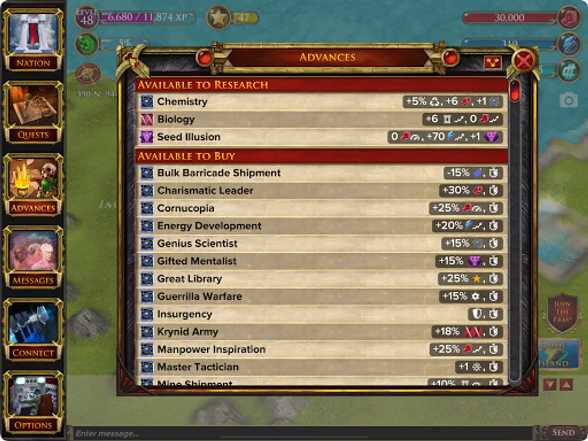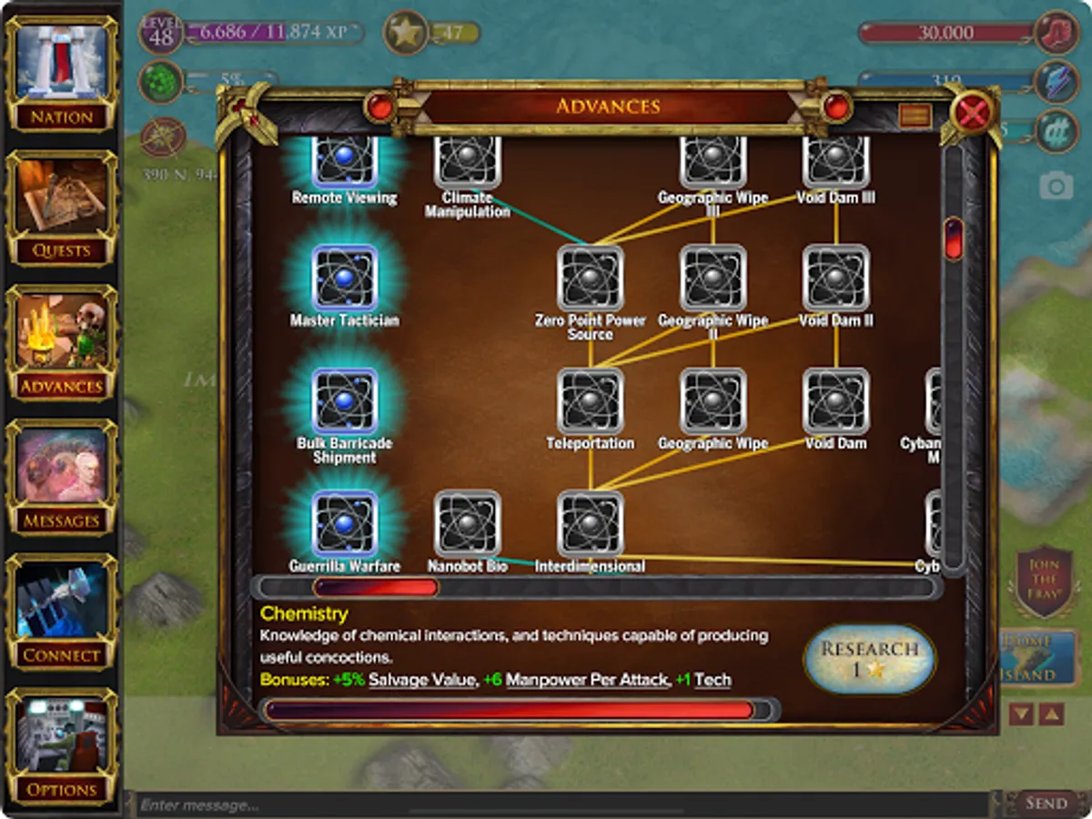 To attack and defend you’ll need to keep up healthy supplies of the game’s two main resources, manpower and energy. How quickly you generate these resources depends on the advances you’ve developed, and whether you’ve captured special map locations such as Fresh Water, Geothermal Vents and many more. How rapidly you generate the energy needed to sustain defenses also depends on your nation’s ‘geographic efficiency’, a measure of how well consolidated your nation’s territories are. This means you’ll need to balance expanding your nation against spreading yourself too thin.