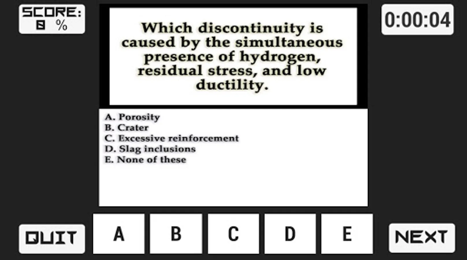 The information contained on Ironhand Welding’s “CWI Practice Exam” application is for practice purposes only. Ironhand Welding assumes no responsibility for errors or omissions in the contents on this application.