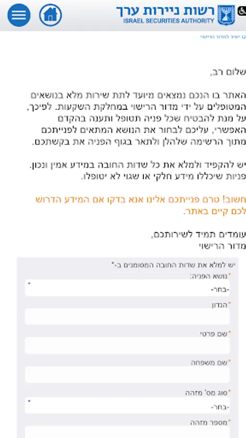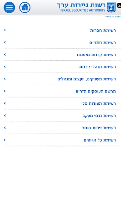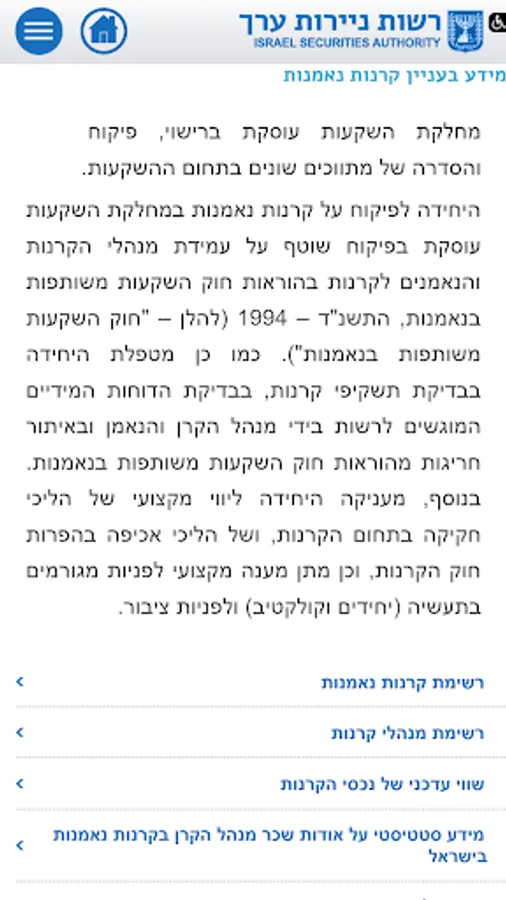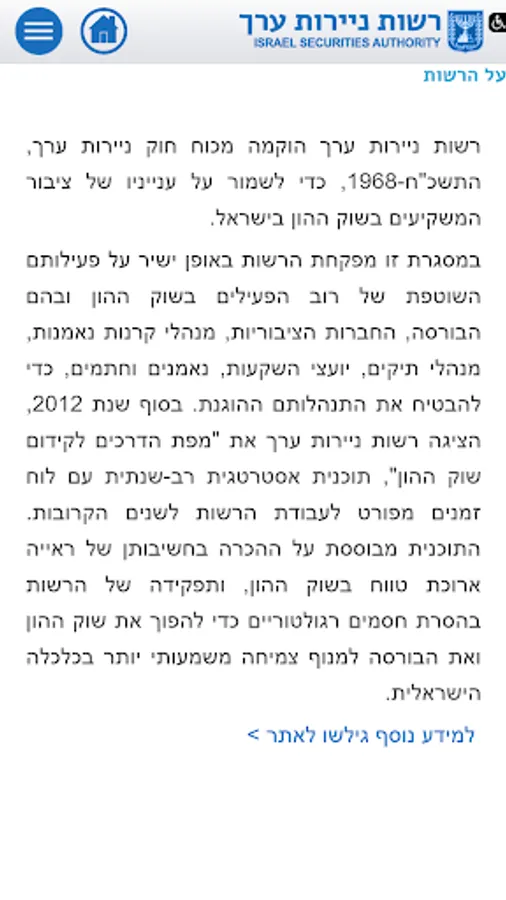 The app provides easy access to some of the contents of the Securities and Exchange Commission's full website (at http://www.isa.gov.il), including: news flashes, press releases, open auction information, vacancy information, investor information, information In licensing matters, mutual fund and ETF information, possibility to search for details about companies, fund managers, etc. In addition, the app allows contact with the authority in several ways, and all from the mobile device.